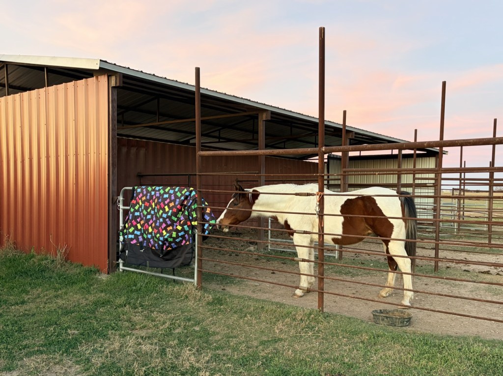 I’ve left the blanket hanging on Dusty’s gate, and I put his food dish near it. He’s still not happy. I guess the old cow horse never needed a blanket before and doesn’t want one now.