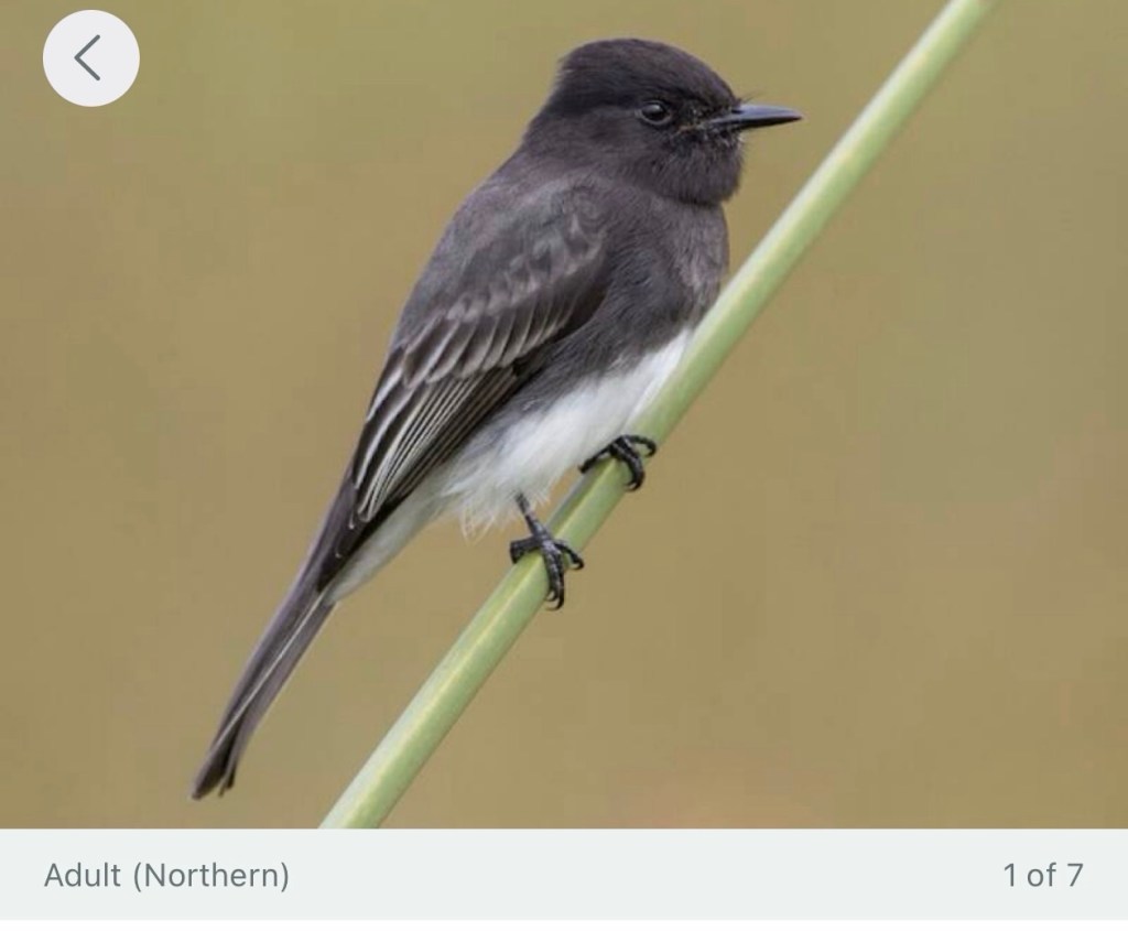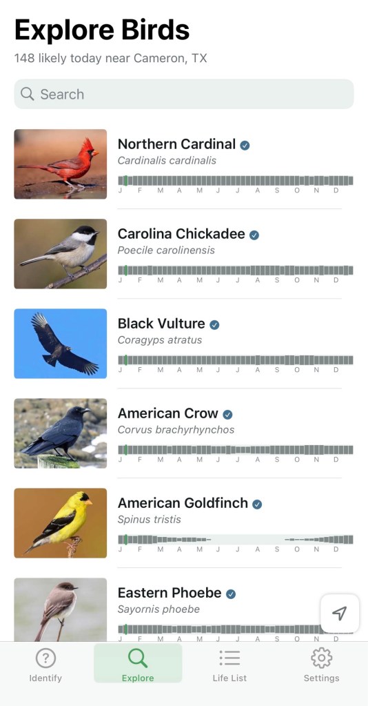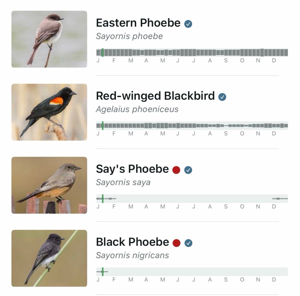 I now feel more confident, since remembered that part of the Merlin app is a feature where it will show you all the birds you’re likely to see on any day. Here are the ones I’m most likely to have seen today in Cameron, Texas. Note the Eastern Phoebe among my good bird buddies.