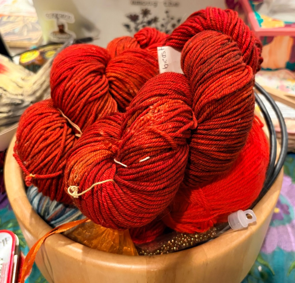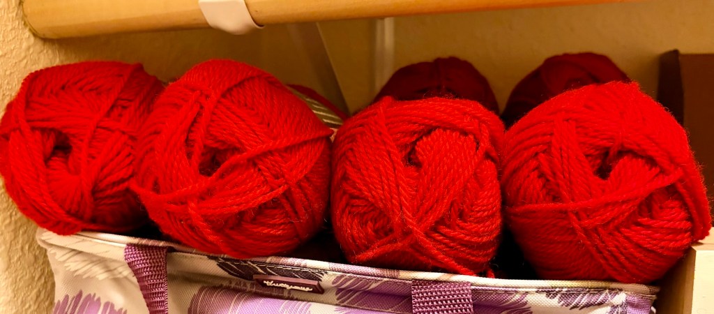 I also got a good supply of red wool worsted for more hats, too. I hope to make some for friends. This will ensure, as they used to say, “no idle hands” (title of a book about the history of knitting).