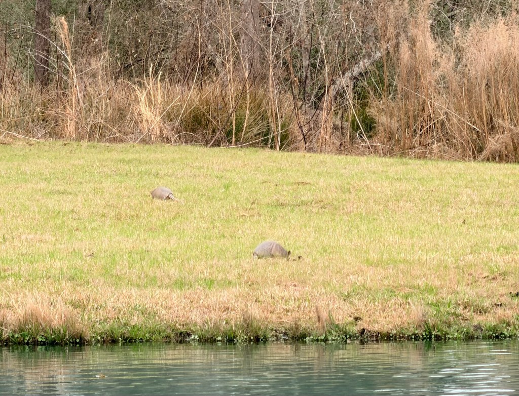 We found more than plants! The resident armadillos were wandering around, we saw a deer, and we got to watch ED feed the big catfish in the ponds. Plus, the cattle followed us around hoping for treats for quite a while. They’re very friendly.