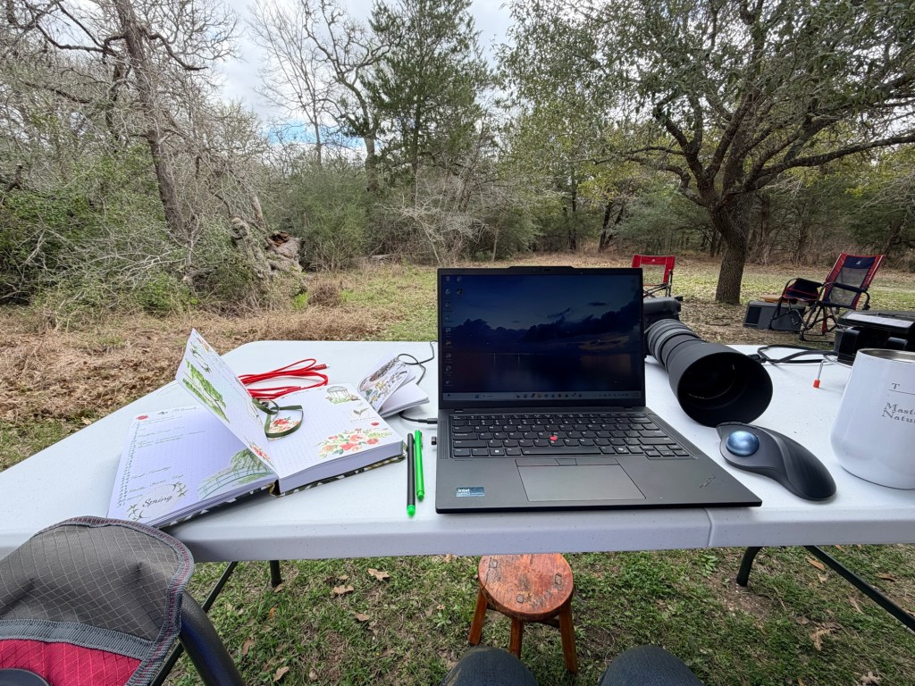 The portable table makes a great and spacious desk. I could watch Cardinals and Carolina Wrens bopping around while I listened to meetings. And thanks to the awning, I was in shade most of the day. It helped that I didn’t need two monitors for anything today.