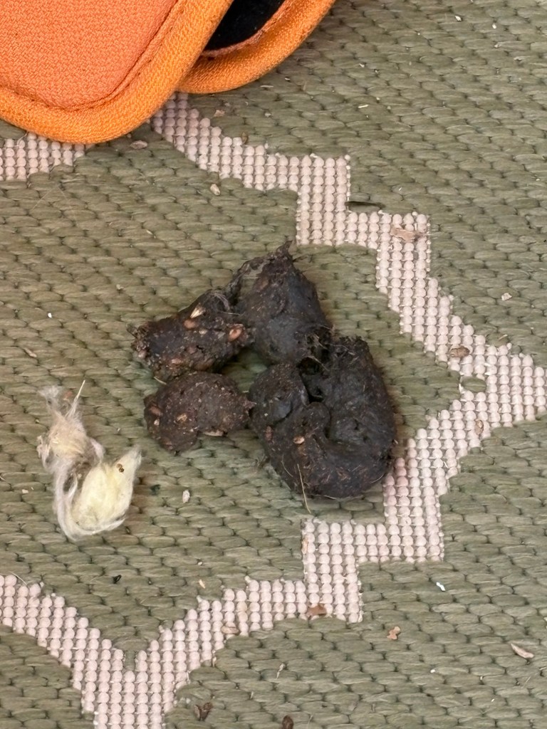 But what was weird was what she found under the desk. It was someone else’s poop! Our best guess is a raccoon, which it kind of resembles. But we aren’t sure. Guesses?
