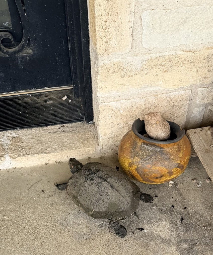 My guess is that the rain got the usually sedate pond turtles in the mood to switch ponds. This one was heading towards the back pond, but the house blocked the most direct path. I hope my visitor made it to the destination and is now enjoying new insects and such behind the house. I hope to see it sunning itself on the tree limbs in the middle of the pond soon!