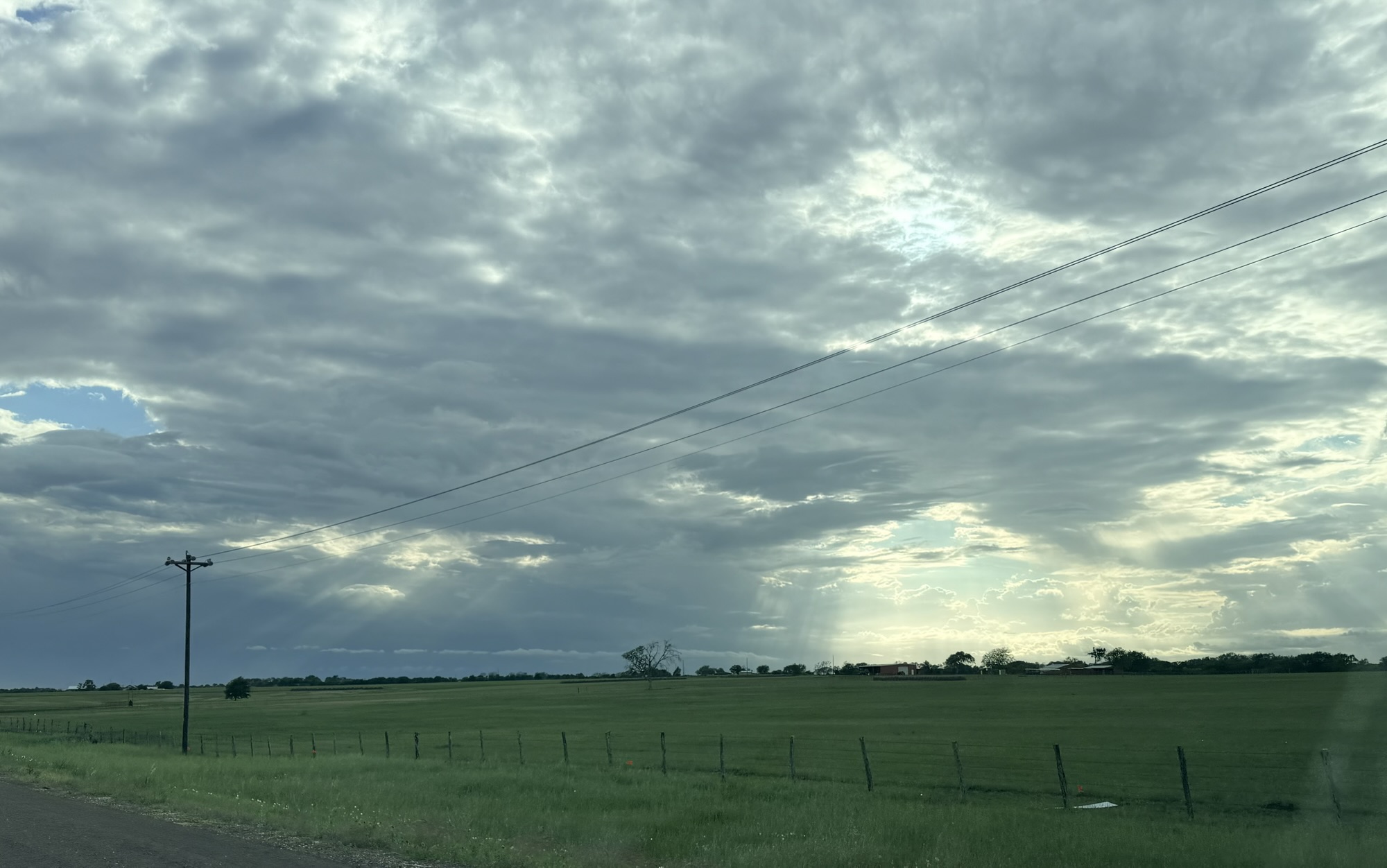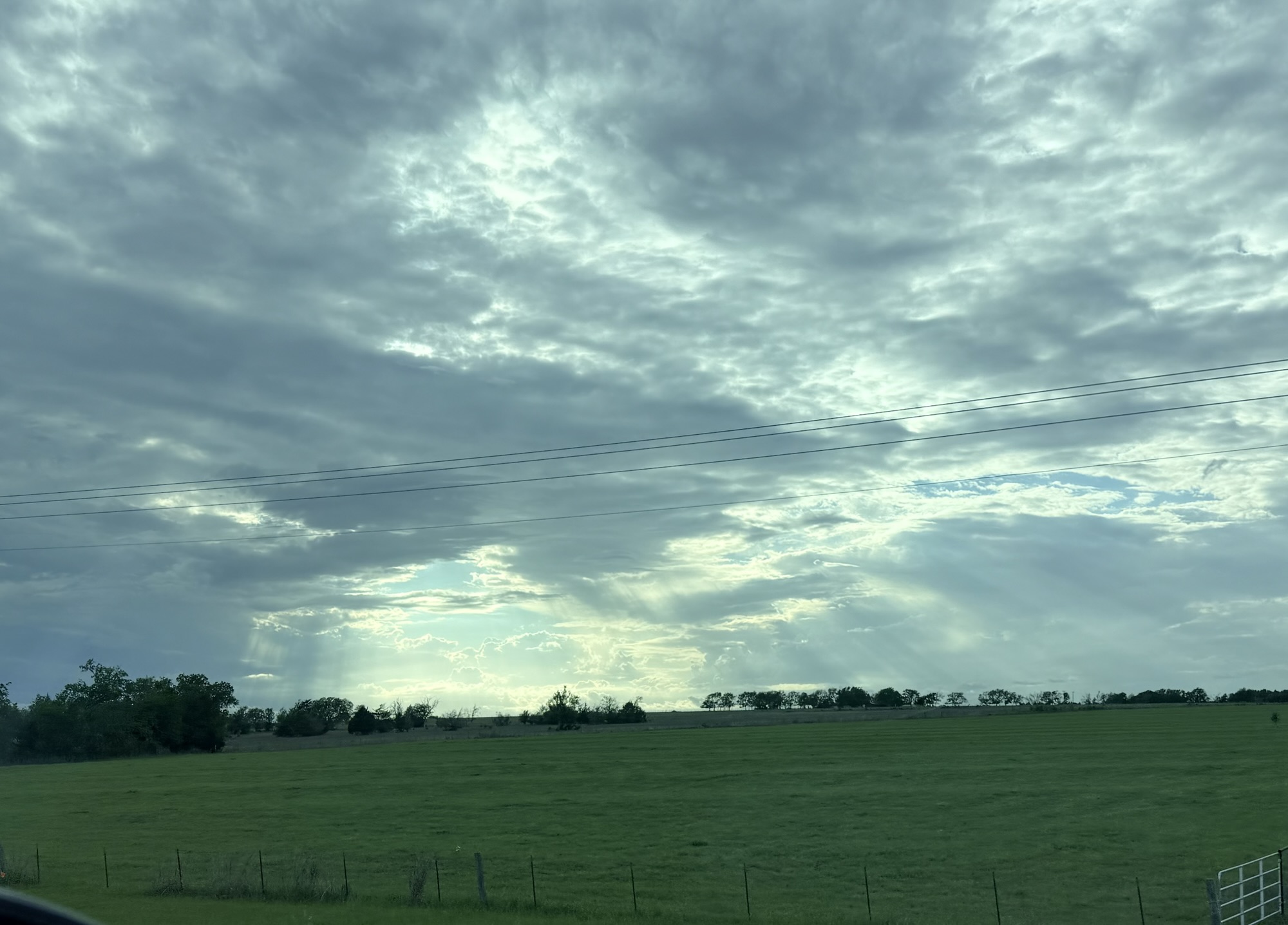 After the walk, Lee, Mike, Martha, and I got in the car and drove around the area like Lee and I did last visit. Mike found a little burger restaurant with burgers as good as Tex Miller’s in Cameron and French fries that were nearly as perfect as Thursday’s hush puppies. I think it was Pappy’s Burger Shack in Caldwell. We enjoyed clouds on the way home.