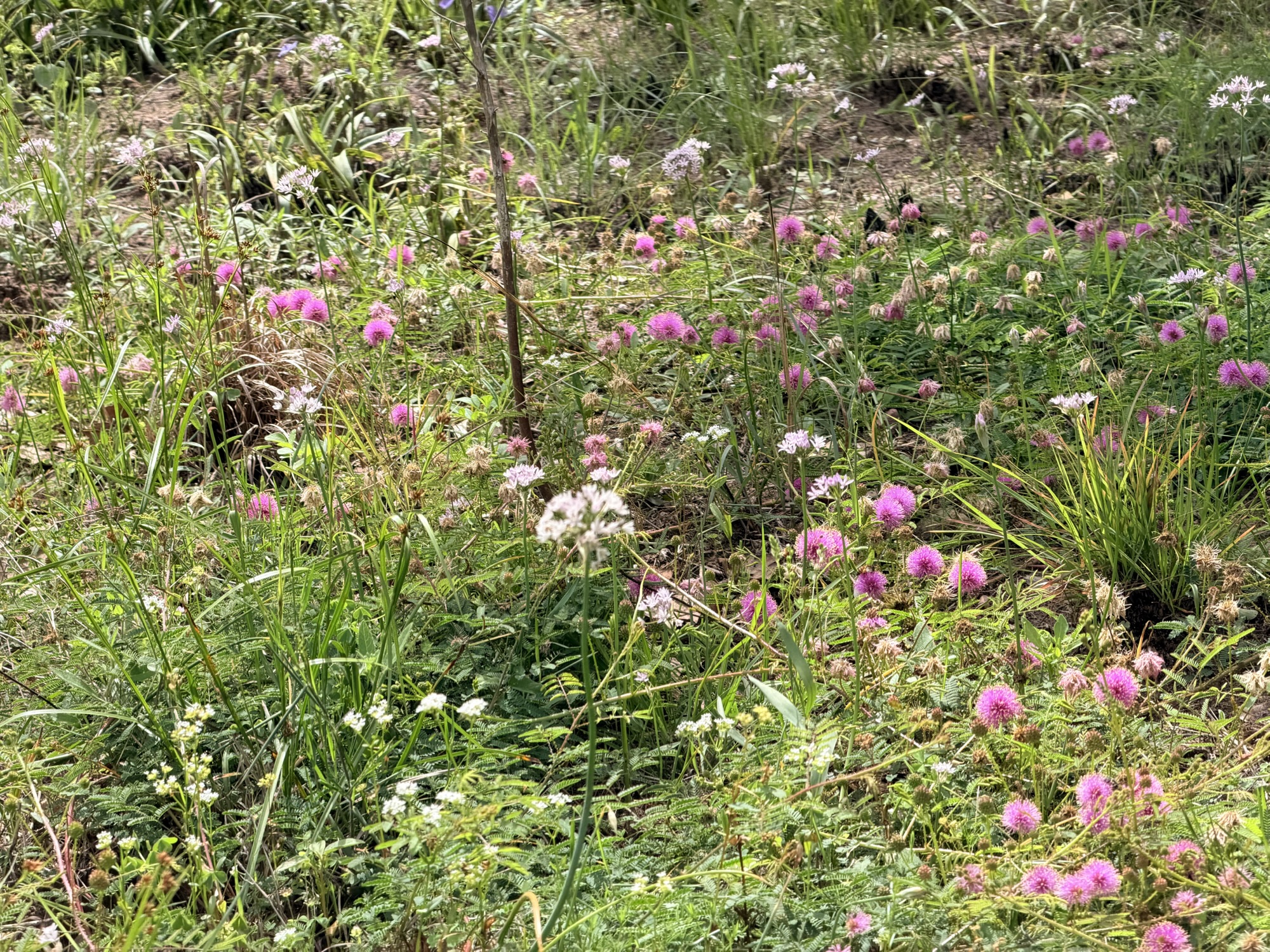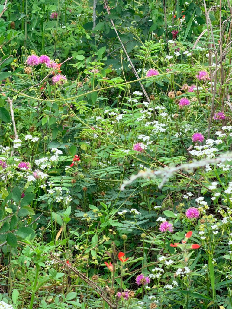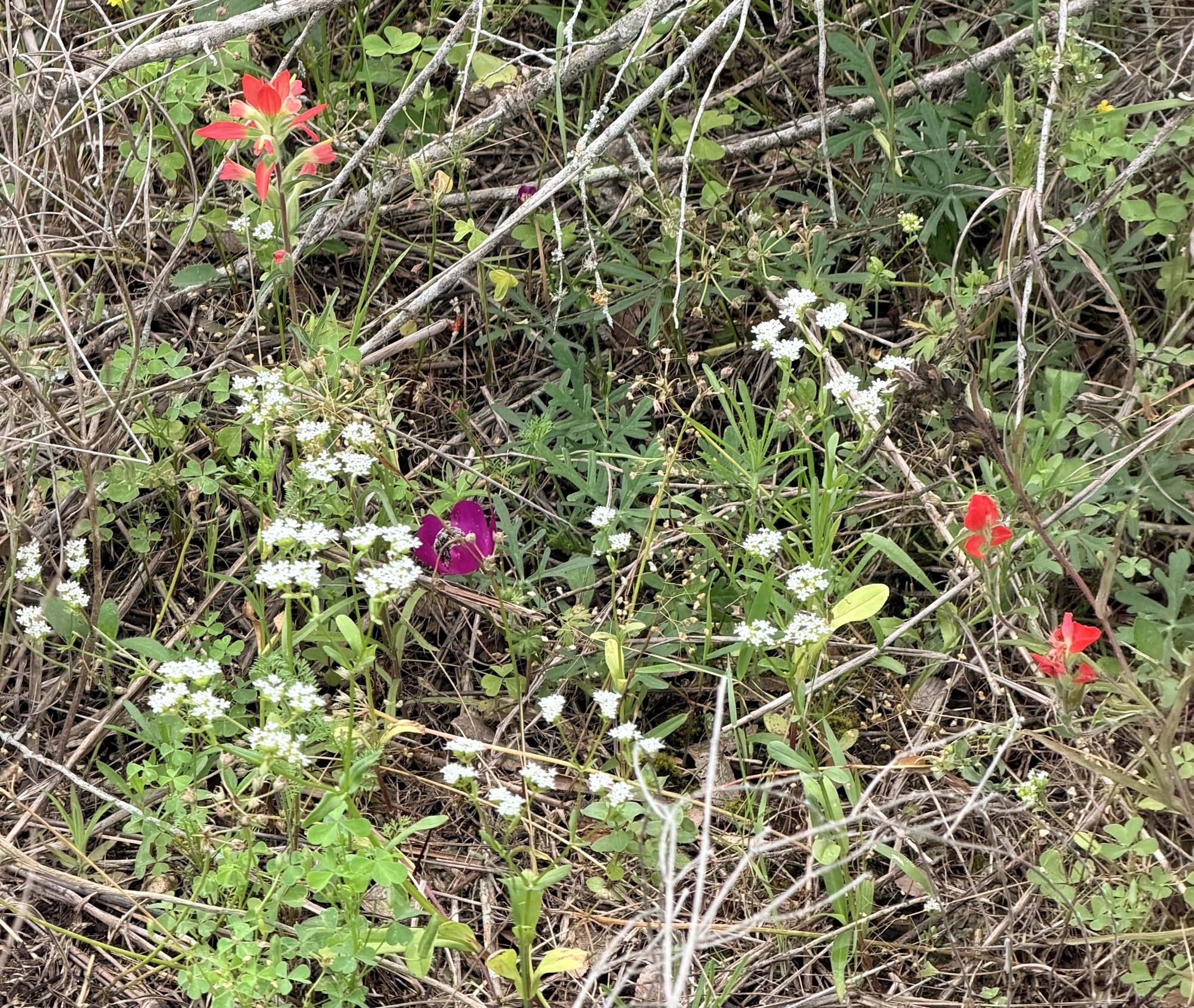 In addition to those, there were hundreds of wild garlic plants blooming, phlox, colorful spider worts, and tiny flowers called Arkansas Leastdaisy or (duh) tiny daisy (Chaetopappa asteroides). There were winecups in large numbers, too. It was not apparent that there were so many flowers unless you looked carefully, but by stopping to look, you’d be greatly rewarded. I was in heaven.