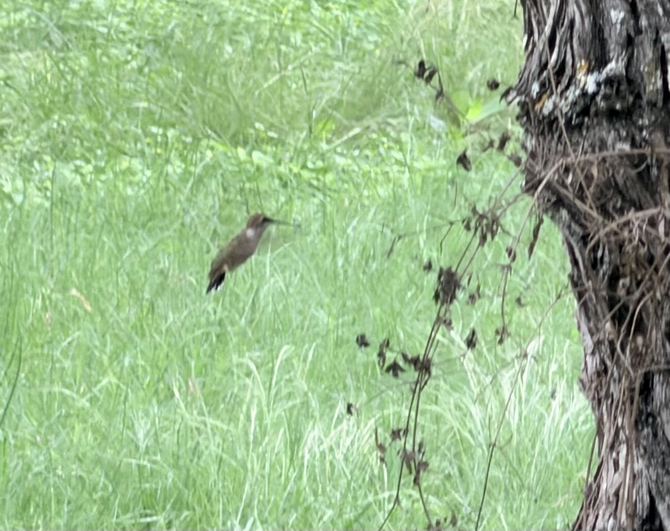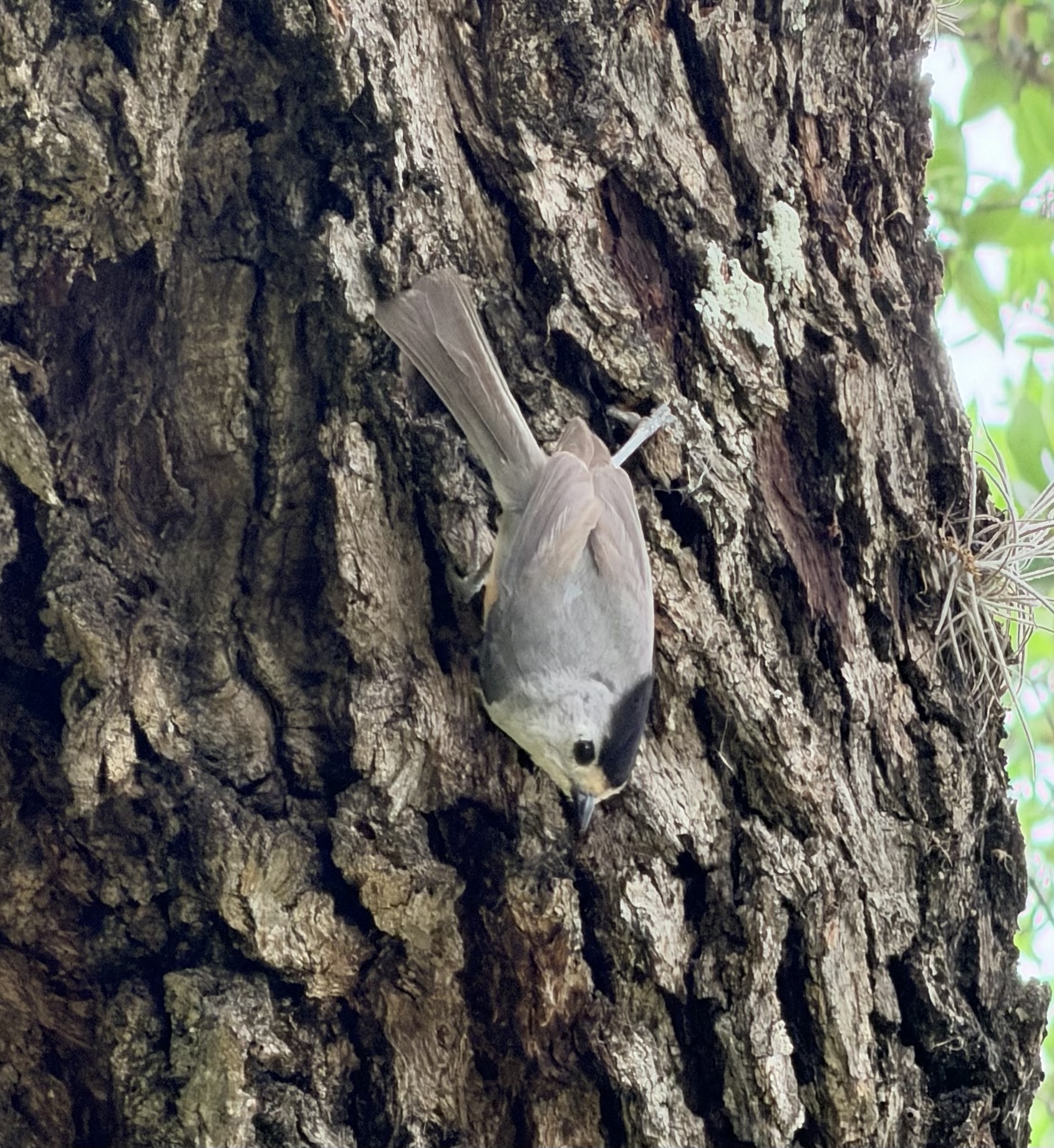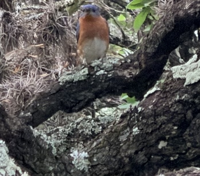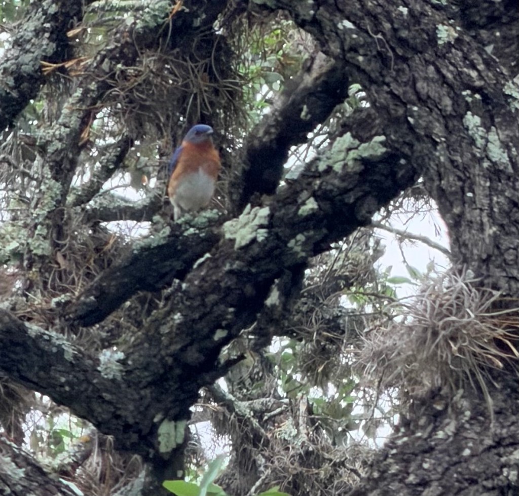 I had fun watching them, Black-crested Titmice, Lark Sparrows, flycatchers, Cardinals, and Eastern Bluebirds for a long time in late afternoon, when the mist finally dissipated. I could just sit in my rocking chair and watch the bird show. Ahh.