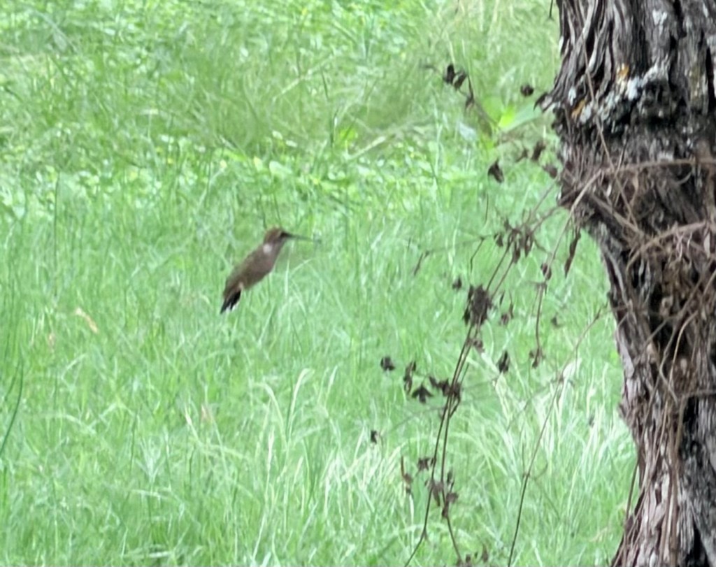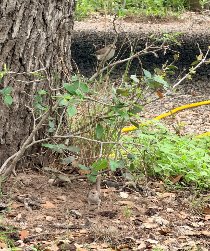 Then I came back and worked a bit. Lee went outside to escape my meetings. Soon, he returned with news. We have our own pair of Bewick Wrens building in the Jeep’s back bumper. Sigh. They’re so sweet but on a futile mission.