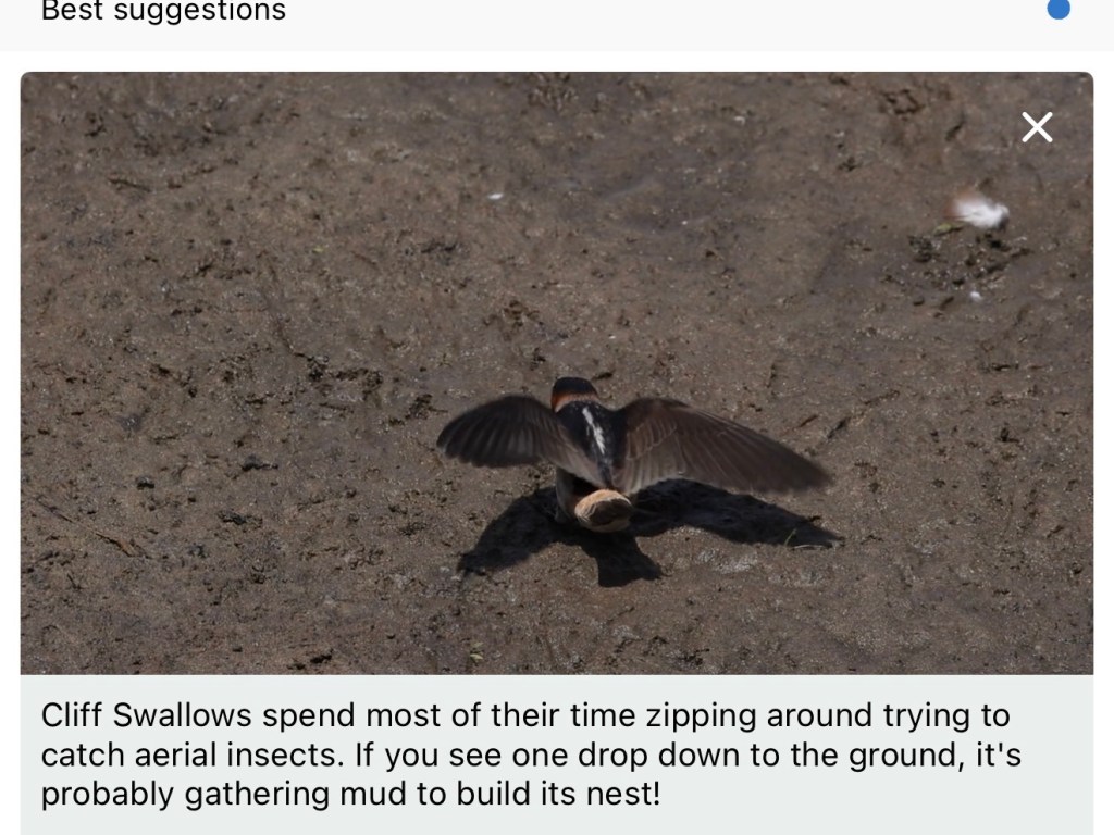 Anyway, when I got back to our site, I looked to see what Merlin had picked up. I saw the app had put one of its bird trivia videos up, which I usually delete. But this one was on Cliff Swallows, so I read it.