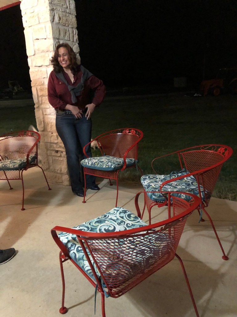 A bonus to the evening was that Carol and Russell delivered a lovely gift. Carol had re-painted my old metal dining set, which I’ve had since the first house I bought with the kids’ dad (so it’s at least 30 years old). It’s now red, the color of a red crayon, just like I wanted. That made me so happy!