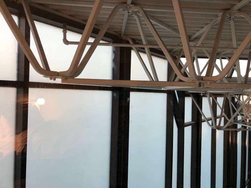 I’ve looked at this hotel for what, 25 years now, but hadn’t been in it until last night. It’s an older one that has obviously seen lots and lots of conferences and workshops, but thanks to COVID has a lot of empty space. I got the corner room on the top floor, facing the courtyard, which gives me an interesting view of scaffolding.