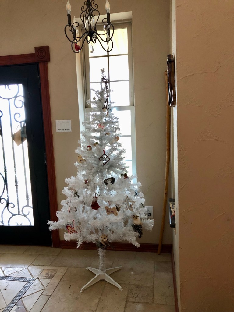 Mandi came over and we were chatting as I put the tree together. It doesn’t look bad, I thought. Then I went to put lights on. Oh, poop. Green light cords do NOT look good on a white tree. So, I just put up all my nature and dog-related unbreakable ornaments. It looks, well, okay.
