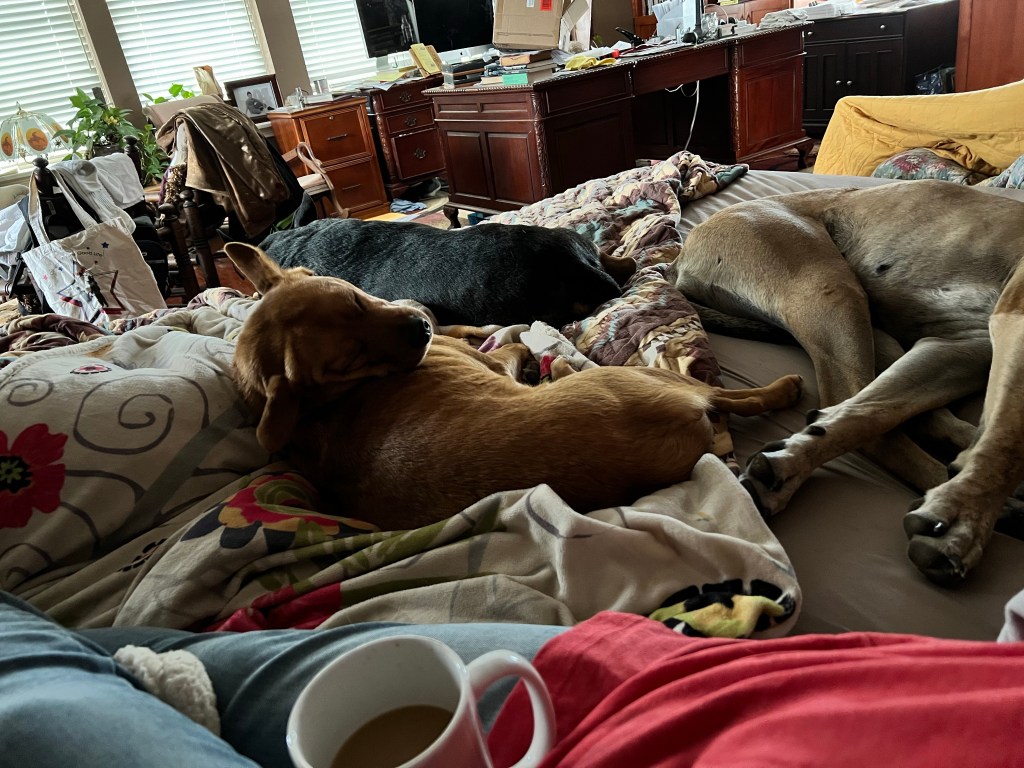 Current bed. Four dogs (the lump is Carlton under the covers depositing dirt).
