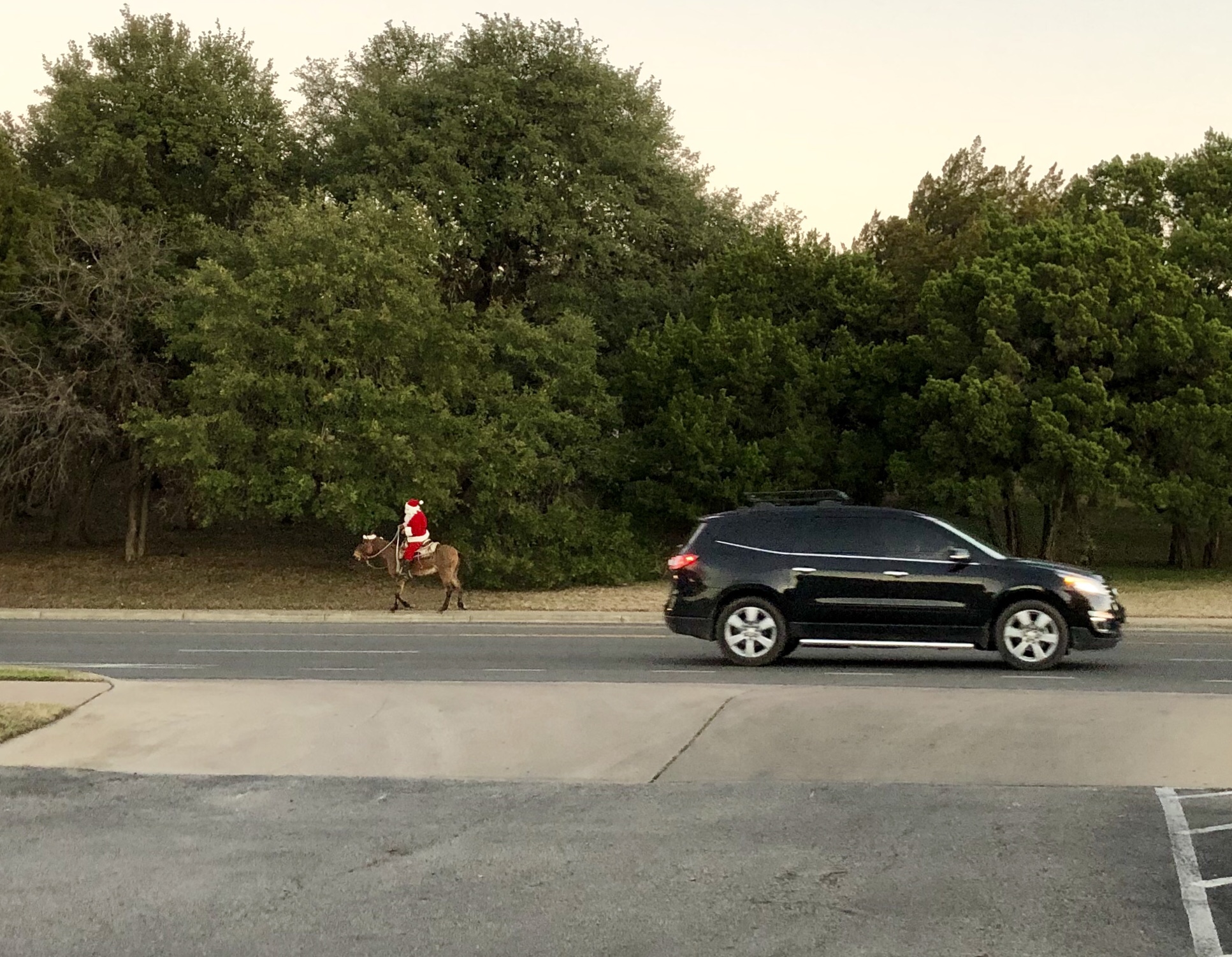 Anita and I were driving to our last haircut by our current hair person (she’s moving to Dripping Springs). Glancing up I saw the totally Austin spectacle of Santa riding a bay mule down South Congress.
