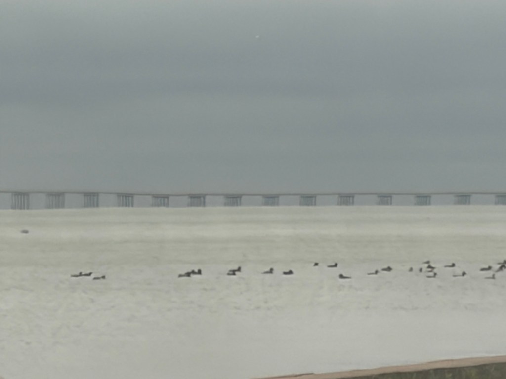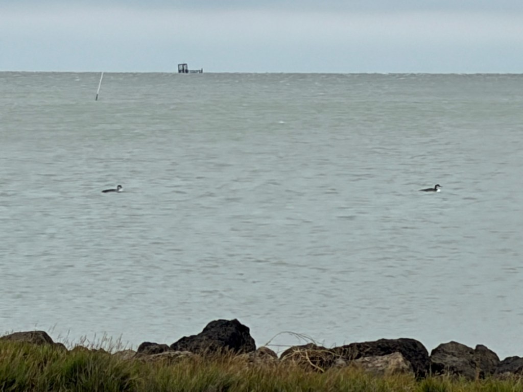 We started out on the big pier near our site, where nothing blocked the wind. I was glad for the railings and that I didn’t bring the big camera! We did see some interesting birds, though it was hard to see them well due to shaking hands holding the binoculars.