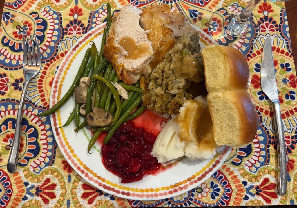Since I had an easy fresh turkey breast to roast, the only dishes I had to carefully cook were my cranberry sauce and oyster dressing. Both came out great. I made green beans and mashed potatoes later, and the only disaster was gravy boiling over. Not bad. I did make a lot of food, but not as much as usual.