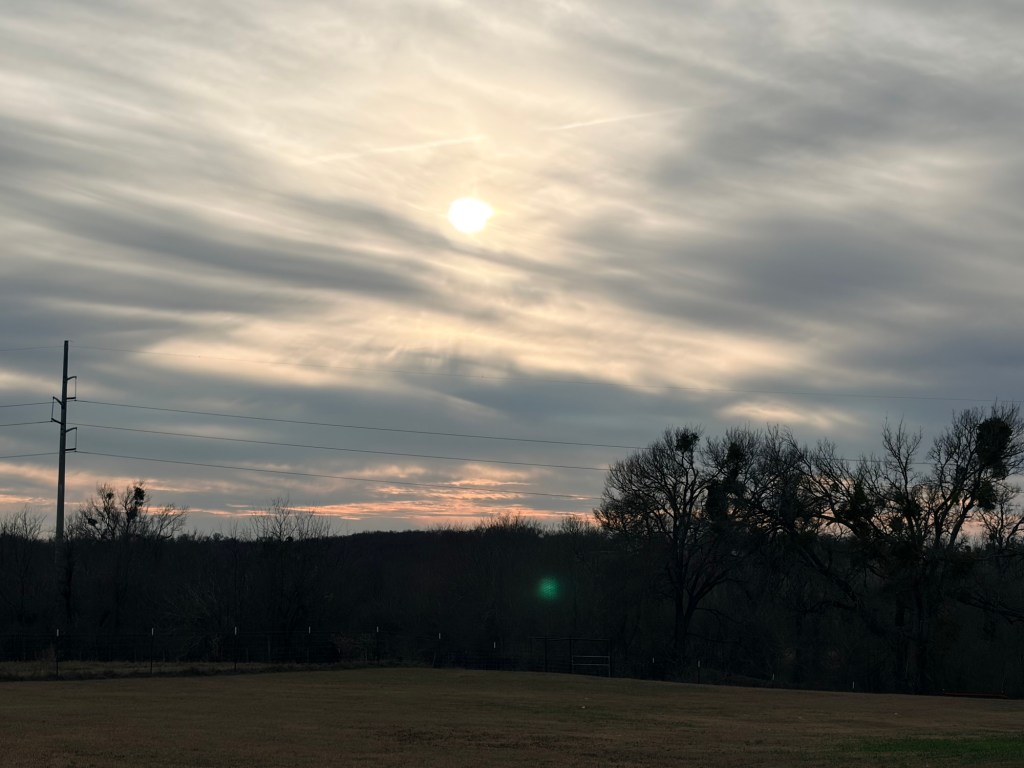 And of course, the blustery wind also returned, merrily tossing things around. We just missed snow, which visited Waco. All animals seem unperturbed—the horses went into their nice shelter until the wind settled a bit, and the fowl went into their nice and out of their coop, which has a heat lamp. I rushed out to toss food at them all. Brr.