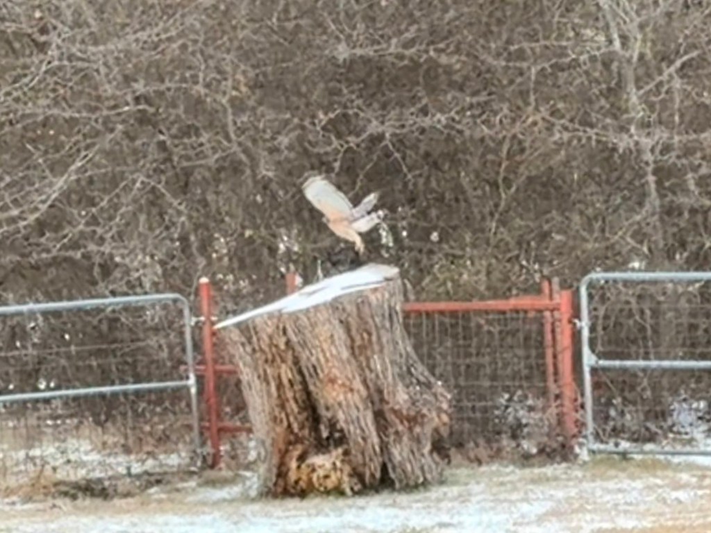 The cold front arrived and we got down to 16°F, with a high of only 24° so my blanket square for today will be all purple! That and getting to watch this hawk on my big stump were the big highlights for my day.