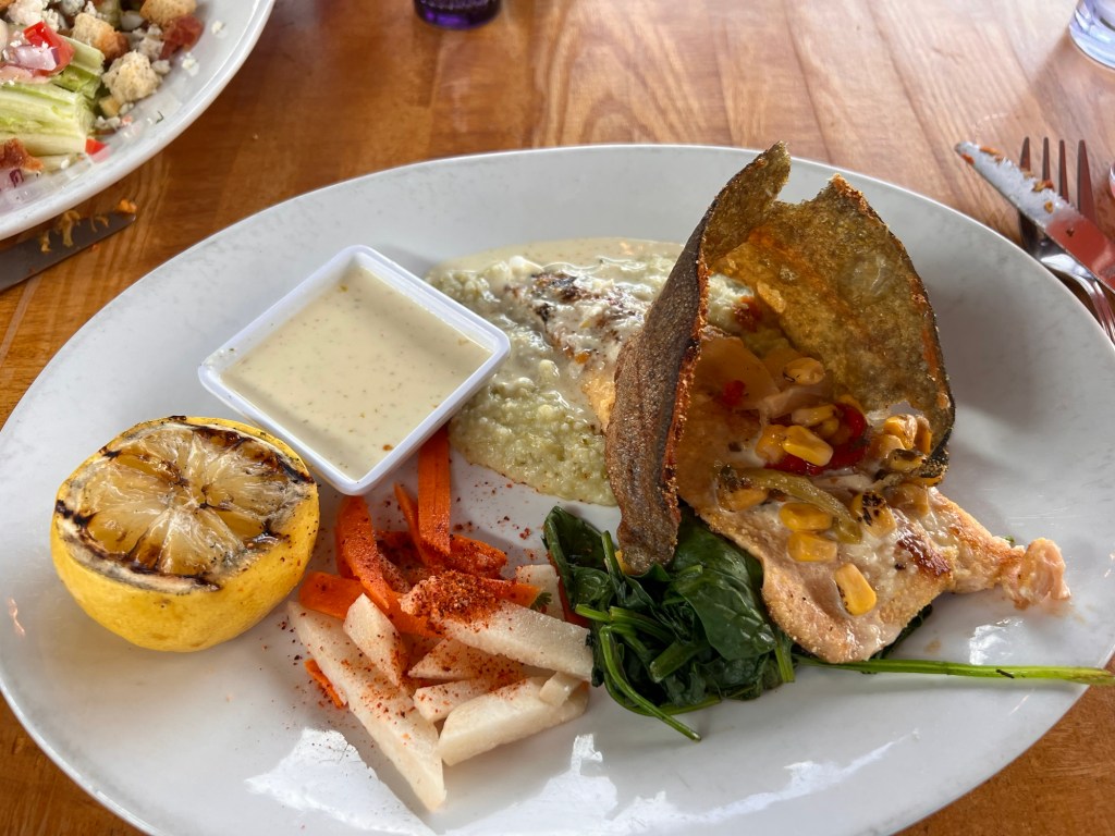 So I took Patty to eat at the restaurant on Airport Mesa. It was quite scenic and the food was very fun. It’s run by the same people who run Creekside, where we ate earlier. Patty had a salad that was immense. The part she took home was definitely enough for another meal. I had trout with spinach and green chile grits with spinach and a jicama garnish. The best part was the fish skin “chicharrón” on top. I like that way better than pork skin. Mmm.
