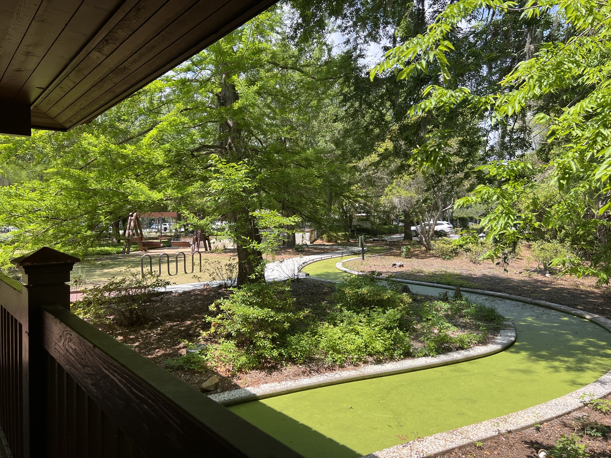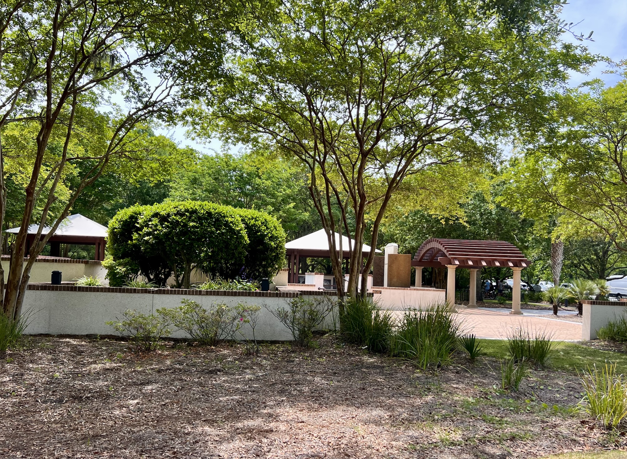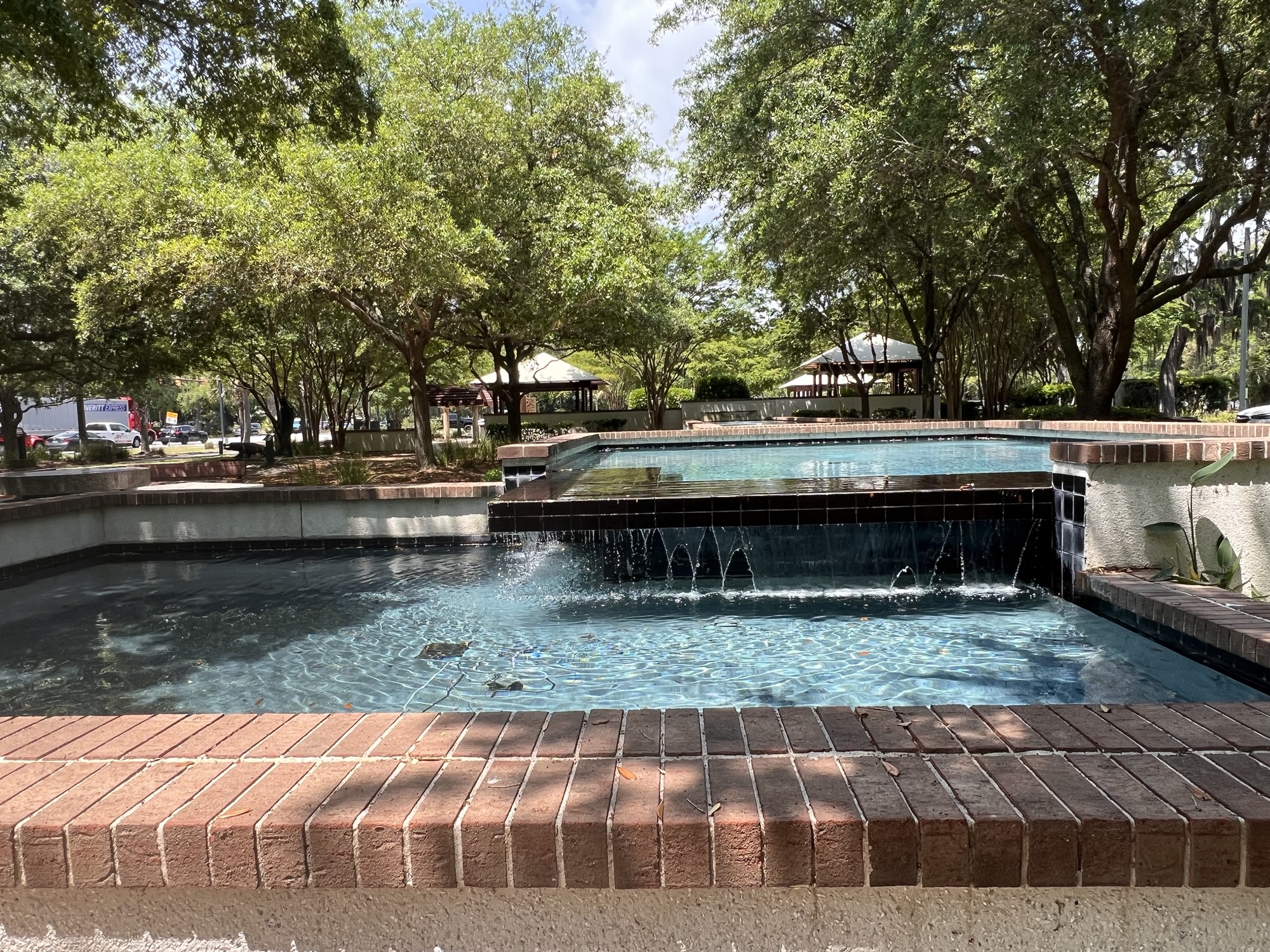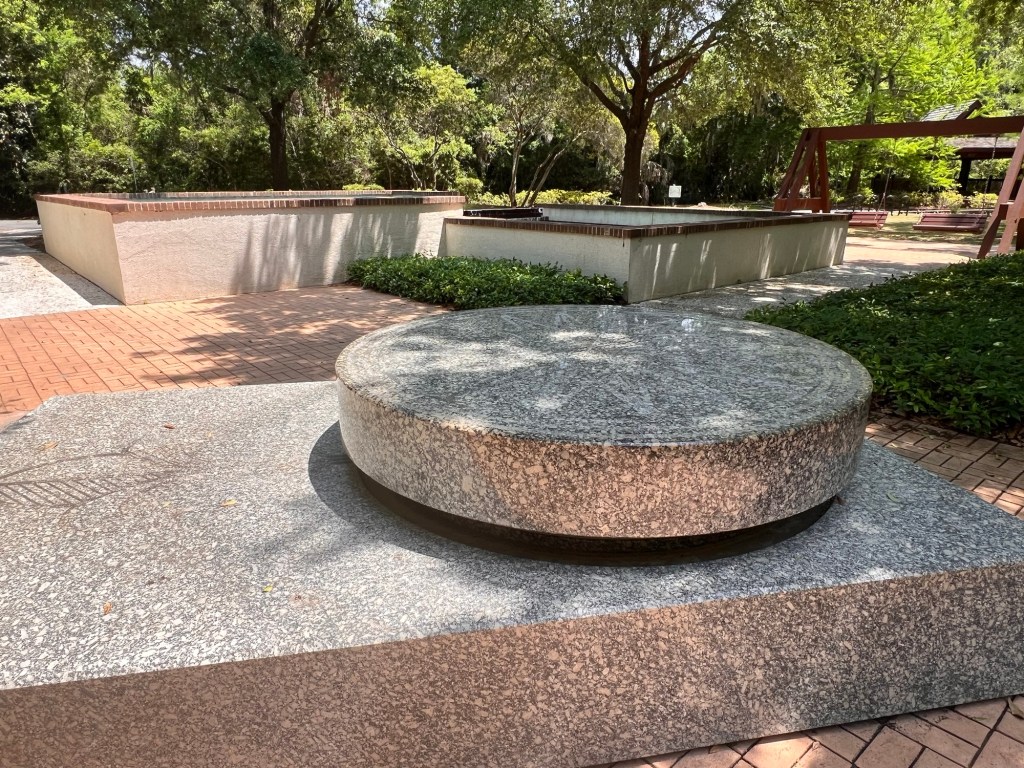 From the parking lot.This looked over a lagoonCompass rayWater featureIt’s a bit dark. Shady park.This looks like astroturf, but is water