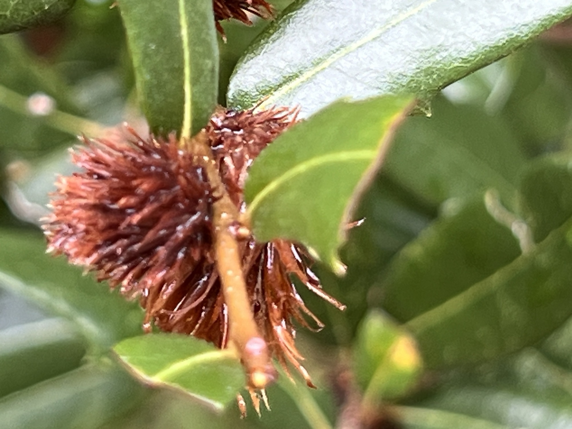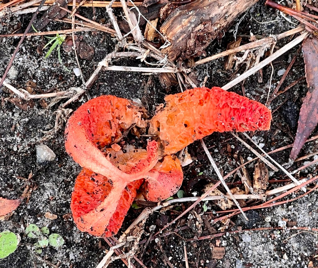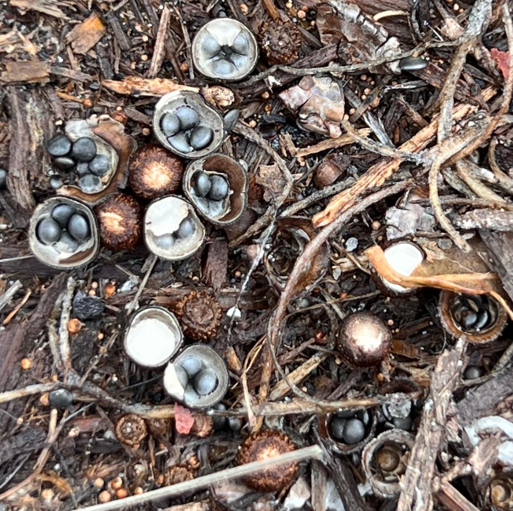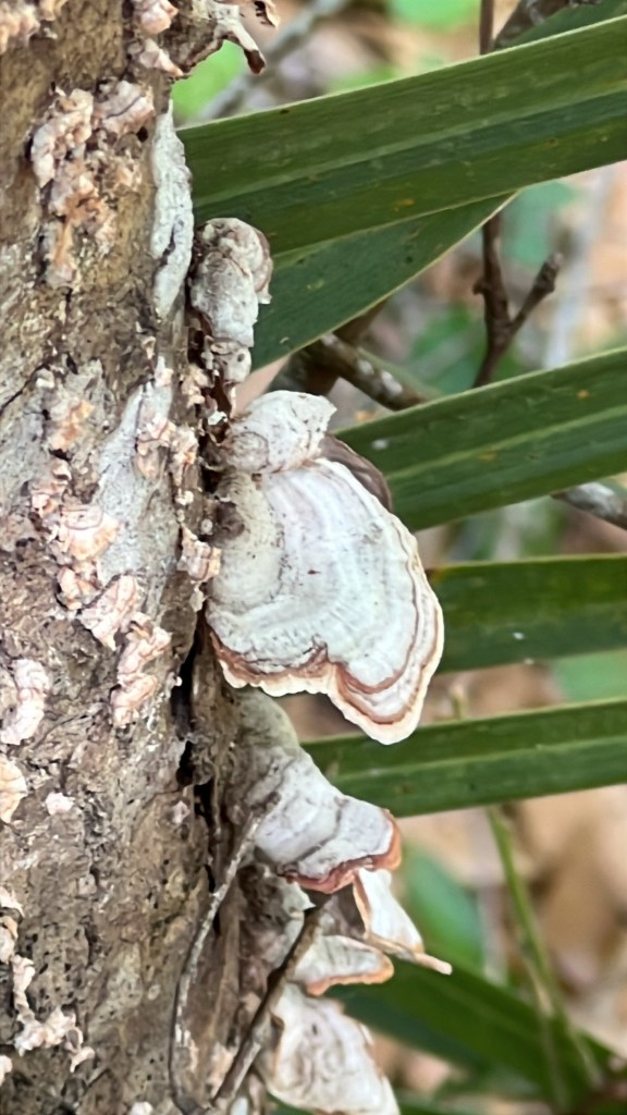 chestnut, palm berries and waterred bay berriesNot berries! Bird’s nest fungus.pig chestnut treepine cone and needlesHairy hexagonia fungusThe prettiest frogfruit I ever sawWater-laden cameliaLeafy oak-gall waspColumn stinkhorn! That means I saw my two favorite funguses in one day!Sightings