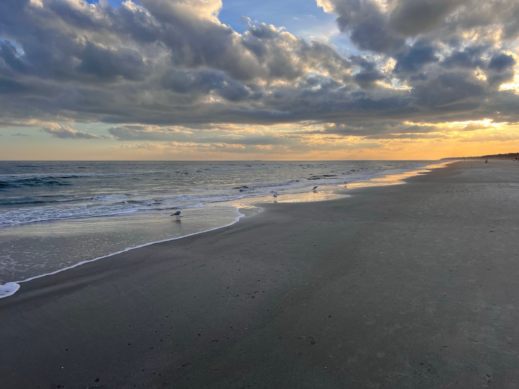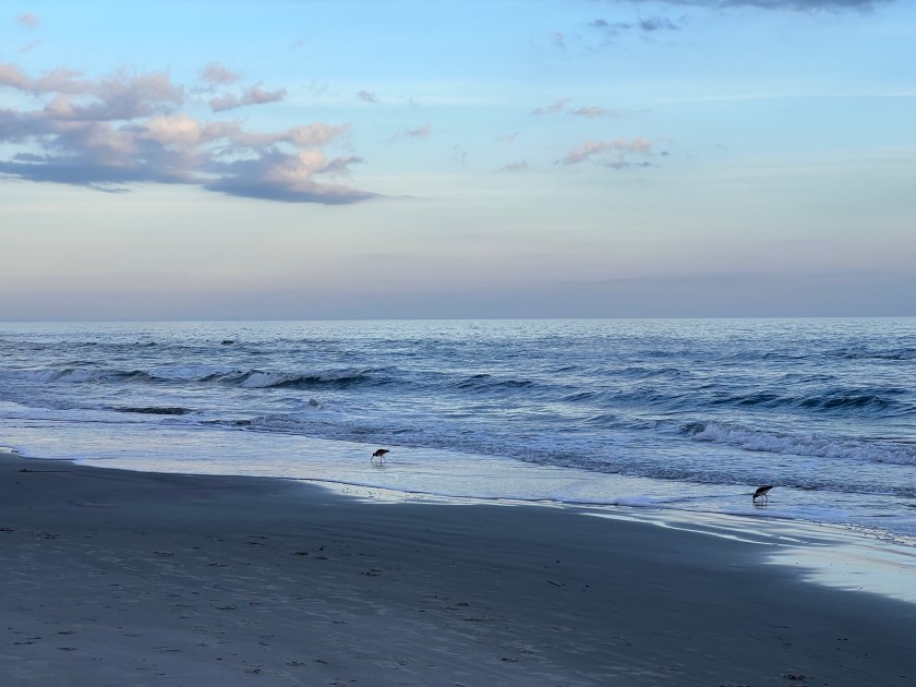 Now, it’s not been all bad. I’ve enjoyed some nice beach walks, sunsets, and the usual birds. The water last night turned a color I’d never seen before, a steely purple. One of my old friends called it steel bluewinkle.
