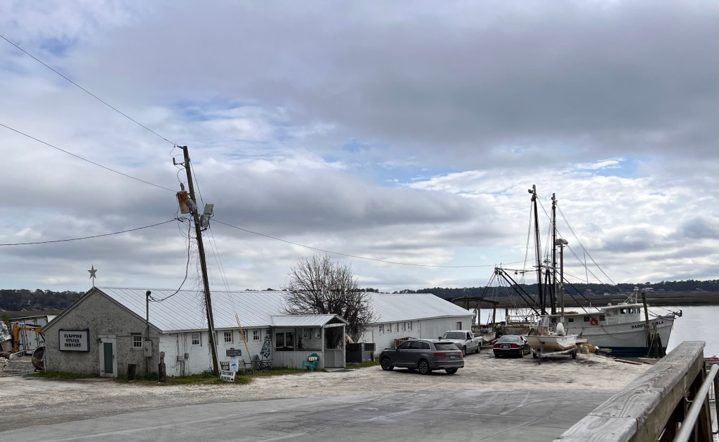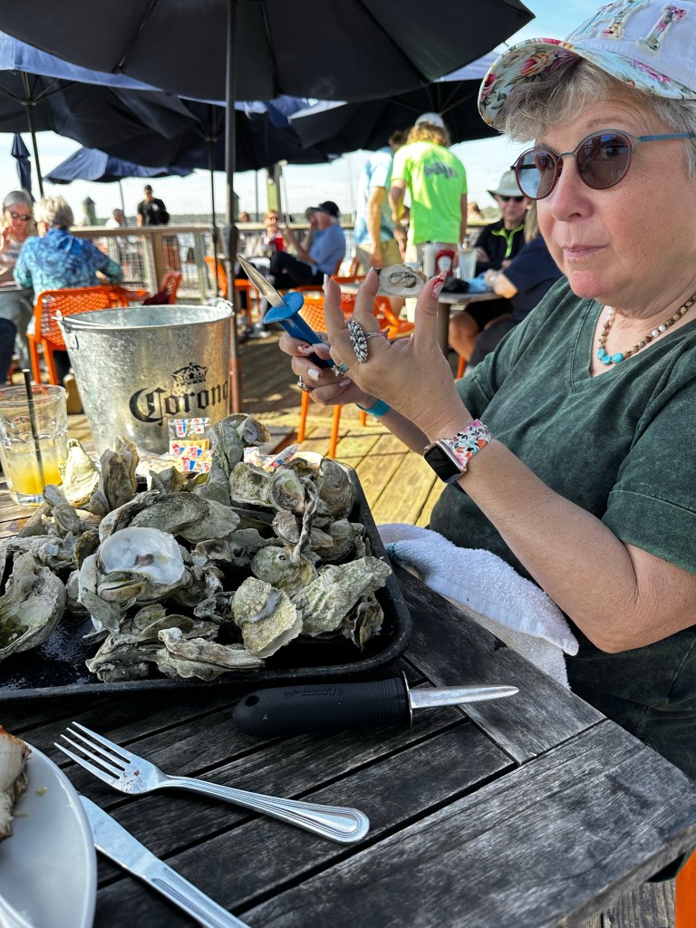 Once I got to a stopping place, we went to a town I’m fond of, just over the bridge, Bluffton. It’s where I got some art that I love last time I was down here (I still follow the artist, Kelley Luikey at Naturemuseimagery.com), so I was happy to go back to the art galleries there again. We also visited a recently restored house that had been owned by a formerly enslaved man who did well for himself. The house is in such a beautiful spot, and the information on the signs told all about how people lived during his life. The house was right next to a working oyster company with a genuine oyster boat. I just have to say this little town is beautiful.