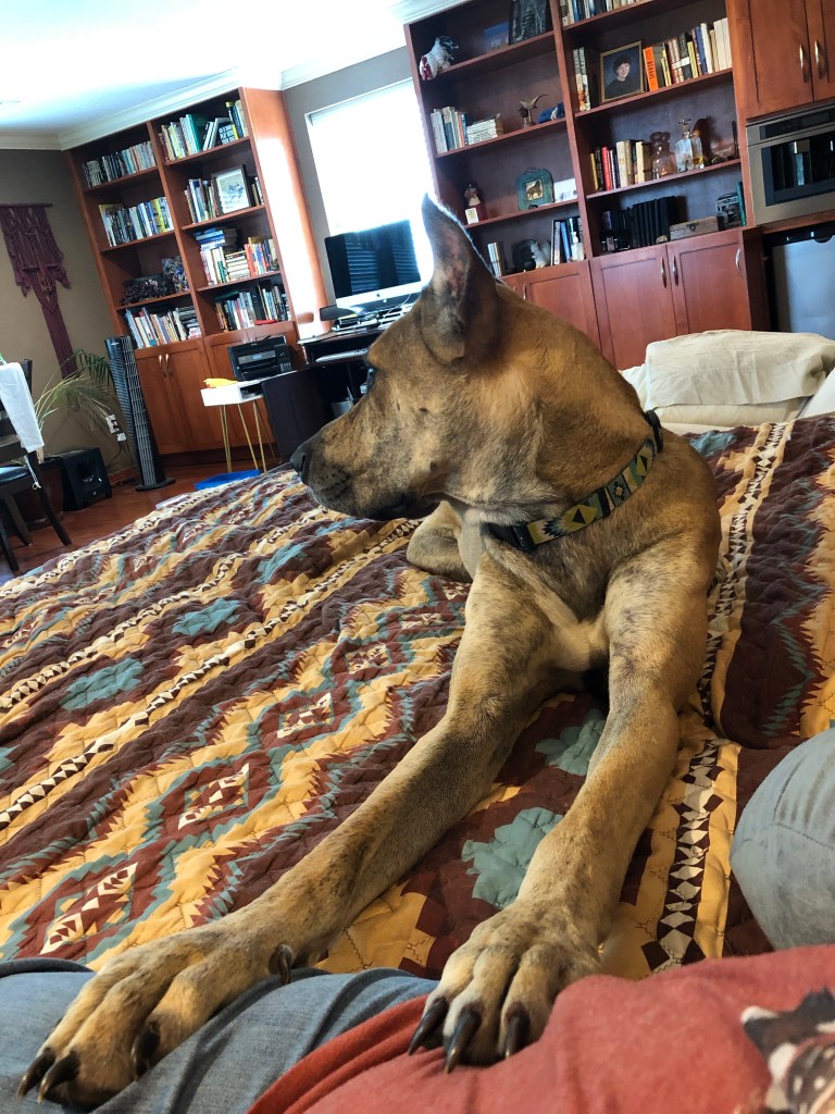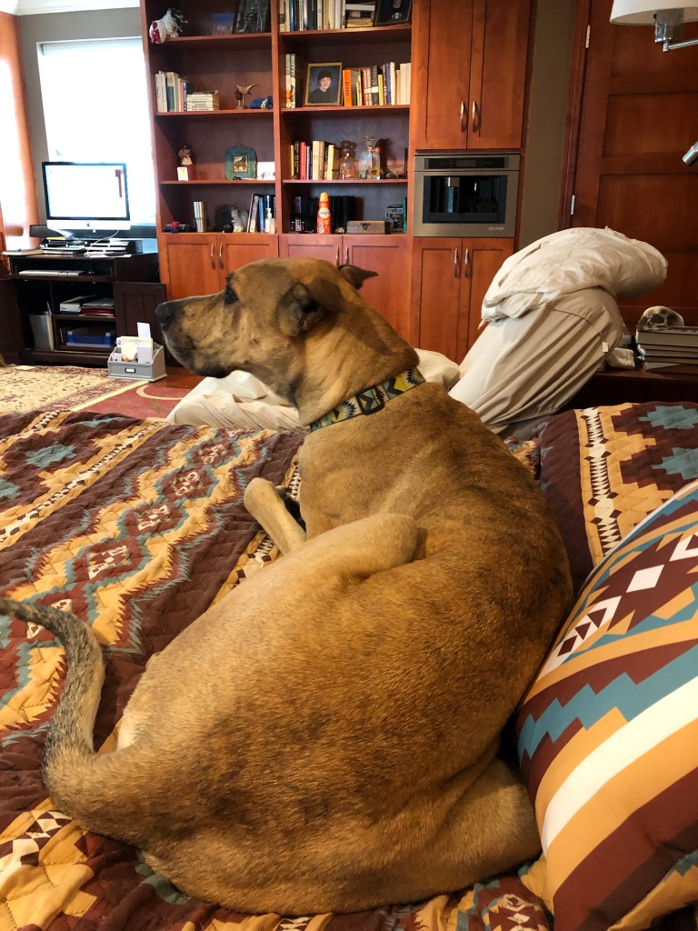 She no longer insists on licking me in the face and sleeping on top of me. She sleeps by my feet, which is just fine. She is a lot less “needy” but still doesn’t like it when other dogs get attention. She does love to sleep in her little bed beside my office chair (usually with Goldie and Carlton on the couch, and Harvey on the floor).