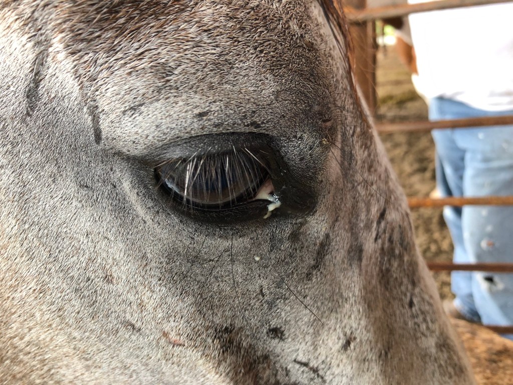 Because of the eye issue, as soon as Trixie left, we loaded poor Drew into the trailer AGAIN and rushed him to Dr. Kildore in Rosebud. They were great to let us in. The vet found he had a lot of debris in his eye, so he numbed it, flushed it, and got everything out. His cornea is not scratched. Whew. He needs ointment in his eye for a few days, then should be okay.