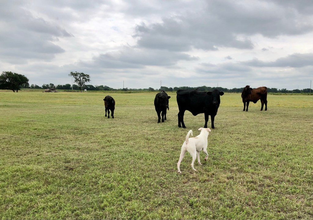 The fancy white heifers currently behind us were quite jealous and wanted to join in the fun. They played with the dogs and the black cows as much as they could, and mooed at Haggard.