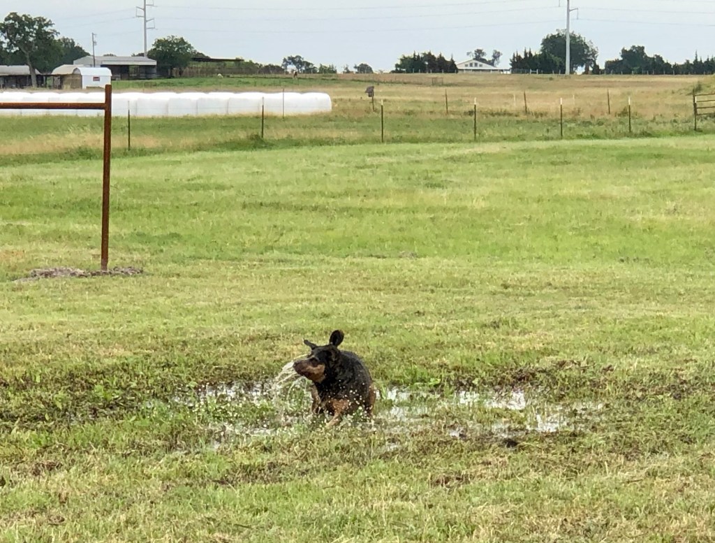 He must have done this ten minutes, running from puddle to puddle. That’s a lot of play for our most sedentary fellow. Carlton and Gracie joined in and got almost as muddy as Harvey, but he looked like a chocolate covered dog at one point.