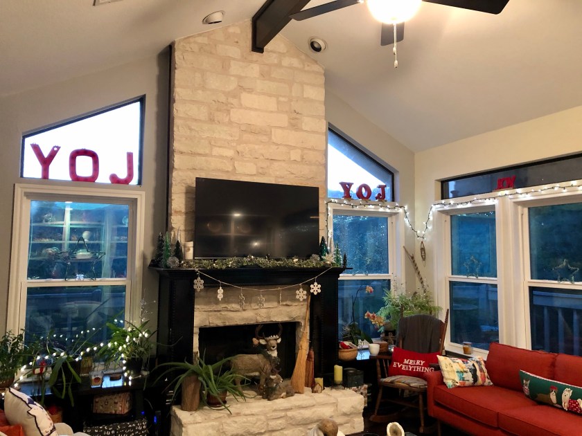 But, there’s another Yule mystery going on! It all has to do with our YOJ sign. I shared the story of it back in 2018, but I bet you weren’t reading the blog in 2018. In brief, I bought this light-up sign that said “JOY” at Target back when we lived at the tiny casita house in north Austin, when Anita first moved here. I proudly set it up in my bedroom window, which was the only window in the house visible from the street. I went outside to view it in its glory, only to realize that I’d set it up backwards, and the sign said “YOJ” (with the J backwards).