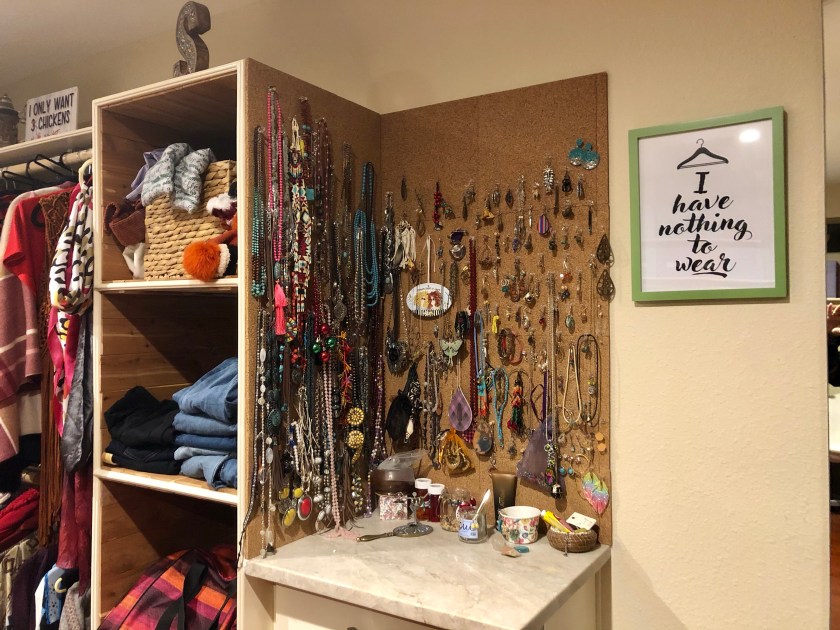 The jewelry area and ironic sign. By the way, the cubes at left weren’t organized yet in this photo. All those things on the top are now nicely organized in a storage bin.