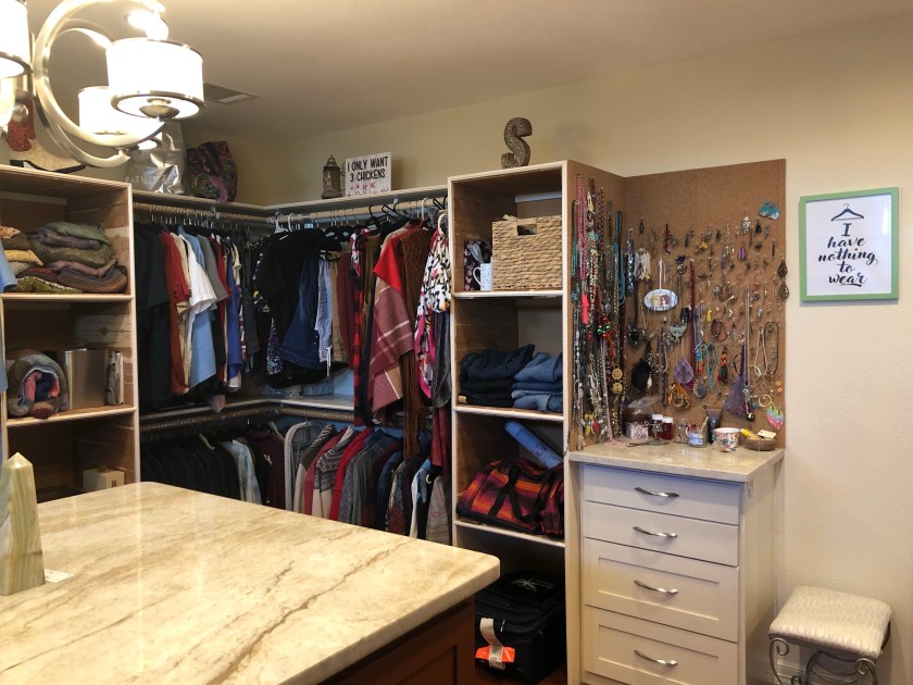 What ended up happening was that our bedroom is ridiculously large, and has a sitting area and a coffee-drinking table and chairs. And my closet, which started out as a perfectly reasonable walk-in closet became as big or bigger than many bedrooms. It was sort of embarrassing.