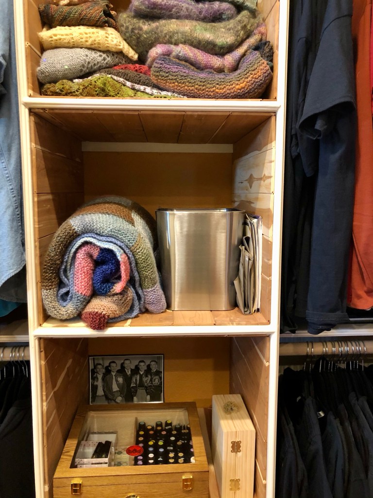On the other hand, it was great, and I could organize things and find them. Our contractor did a GREAT job making this a great closet without spending too much money on it. The storage cubbies are lined with cedar, for my hand knits, he built me a jewelry holding area with cork to hang things from AND a chest of drawers for non-hanging things, plus the mirror and the chandelier. It’s nice, but not California Closet crazy.