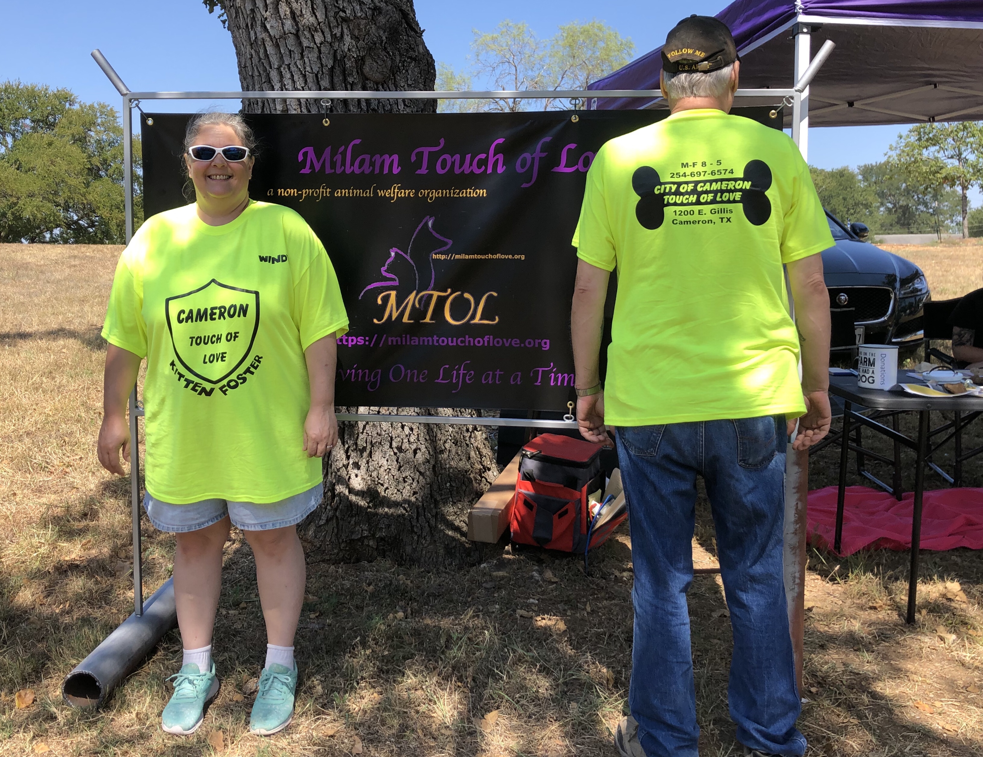 A lot of our volunteers have dropped by, including Tom and Windy, who do the kitten rescue and fostering for the Cameron Touch of Love. They got these bright shirts so people can easily see them when they are rescuing cats from “interesting” places. We all love the color!
