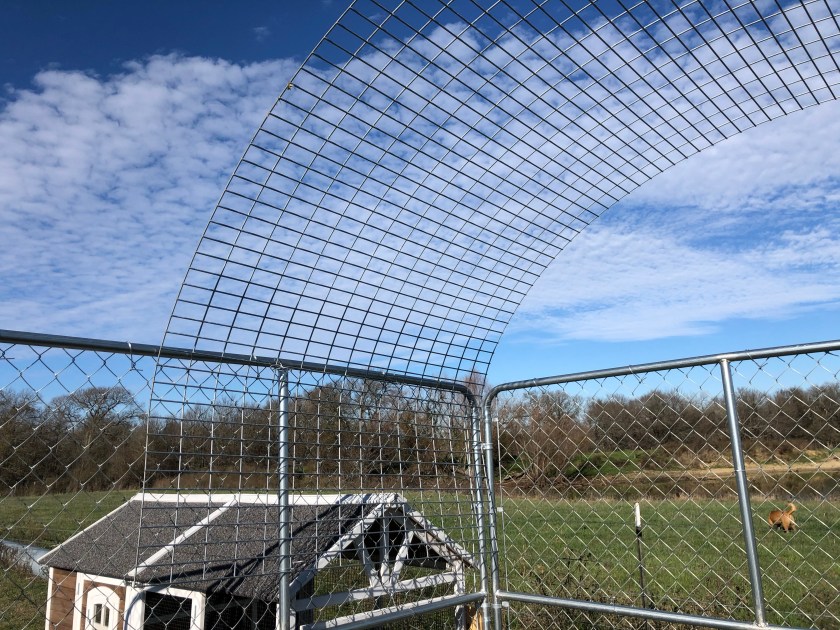 This morning we got going as soon as we were coffeed up, and with assistance from my brother-in-law Jim and less assistance from me, Chris got a really cool arched roof on the chicken run that will thwart even the most clever hawk or owl. HA! Raptors go eat something else!
