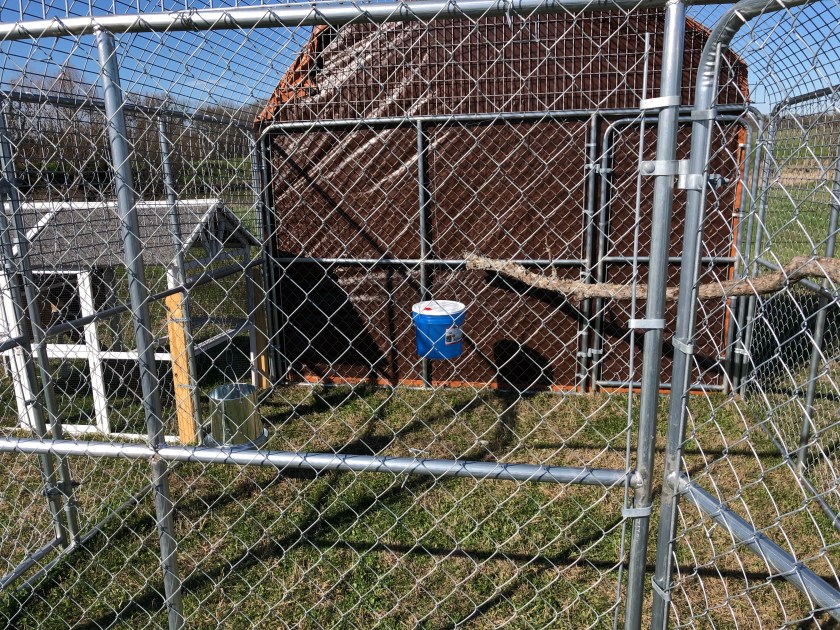 After we finished putting a wind barrier up on the north side of the chicken coop, we took a break, then went over to the Cameron Touch of Love to finish the last touches on the dog run we’re donating.