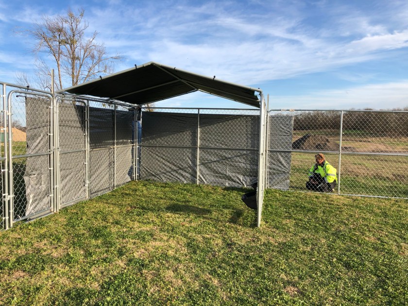 We donated the money to buy the materials to the Milam Touch of Love organization, which supports the welfare of all animals in Milam County, and on which Sue Ann has served on the Board since it was founded. As we shared earlier, we got the materials on Thanksgiving weekend, but had to wait until our crew came back into town before the big job of building the dog run could be done.
