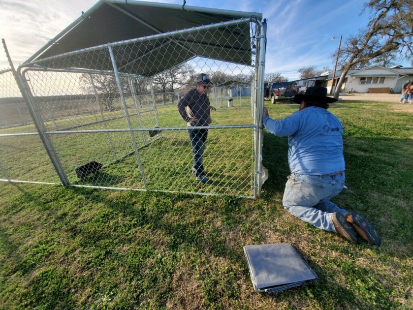 I‘m so proud of the work that Lee’s nephew, niece, and brother (Chris, Kathleen and Jim) did yesterday at the Cameron dog pound. On behalf of our company and through the Milam Touch of Love organization, they put together a huge, safe dog run so the pound puppies can get exercise and play with each other. It’s also a great place for potential adopters to get to know the dogs. Below is a slightly edited version of what I wrote for Hearts Homes and Hands this morning.