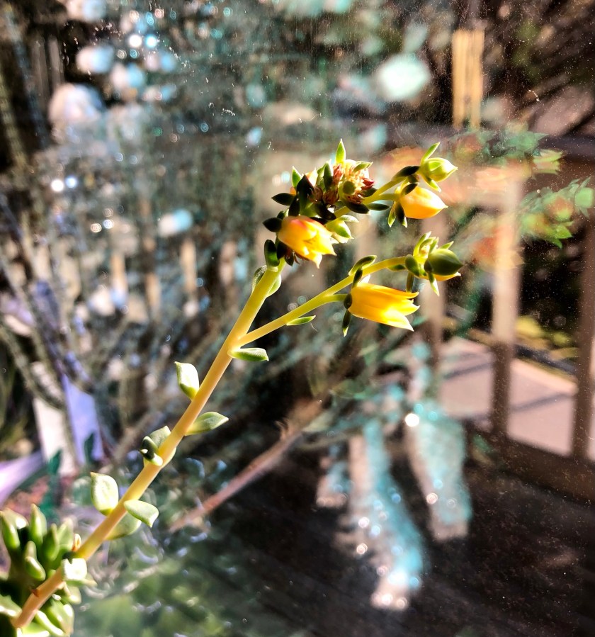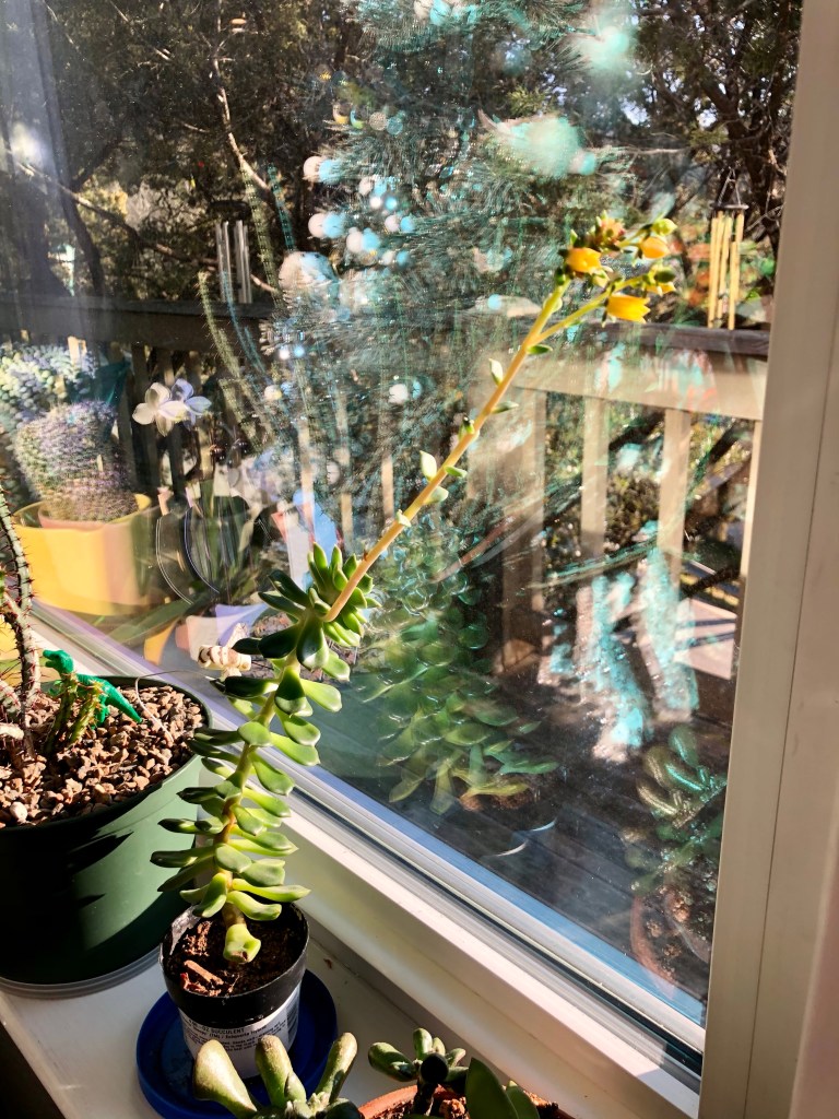 The plant just threw up a big ole stalk and bloomed.That’s quite a stalk (and quite a cool effect the double-paned windows make with the reflections!)