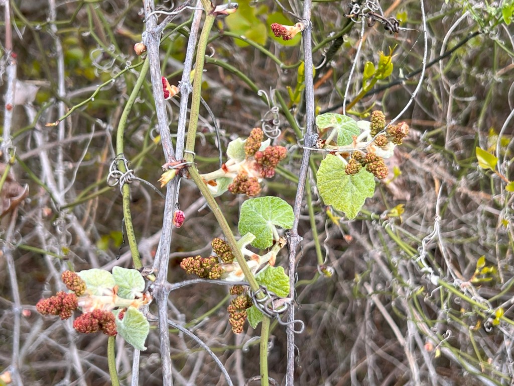 Well. The plant was a yellow passionflower (Passiflora lutea). The caterpillars were Gulf fritillary babies. The butterfly had been laying eggs. Right there, the whole circle of life! Now I know the host flower for these guys.