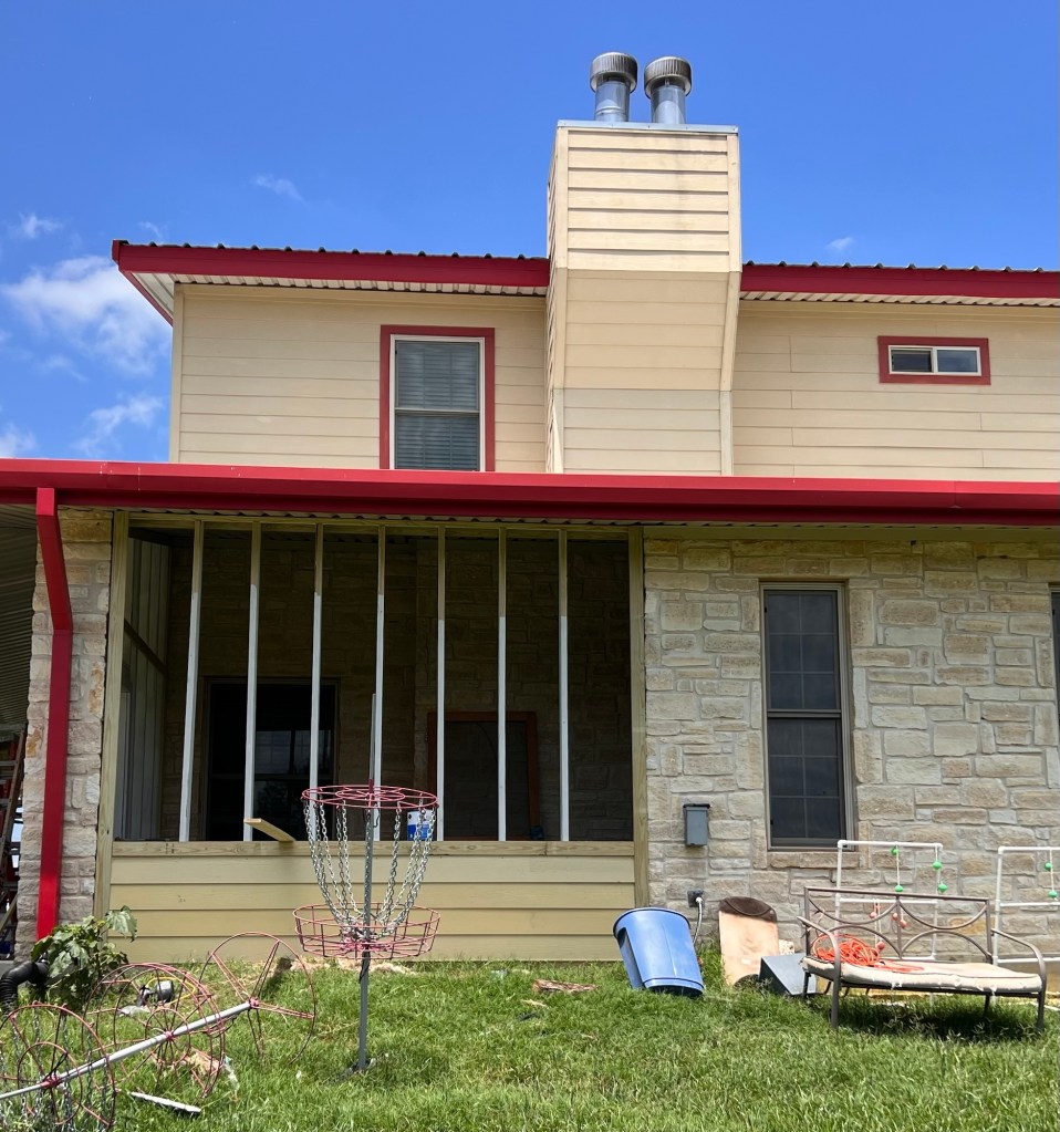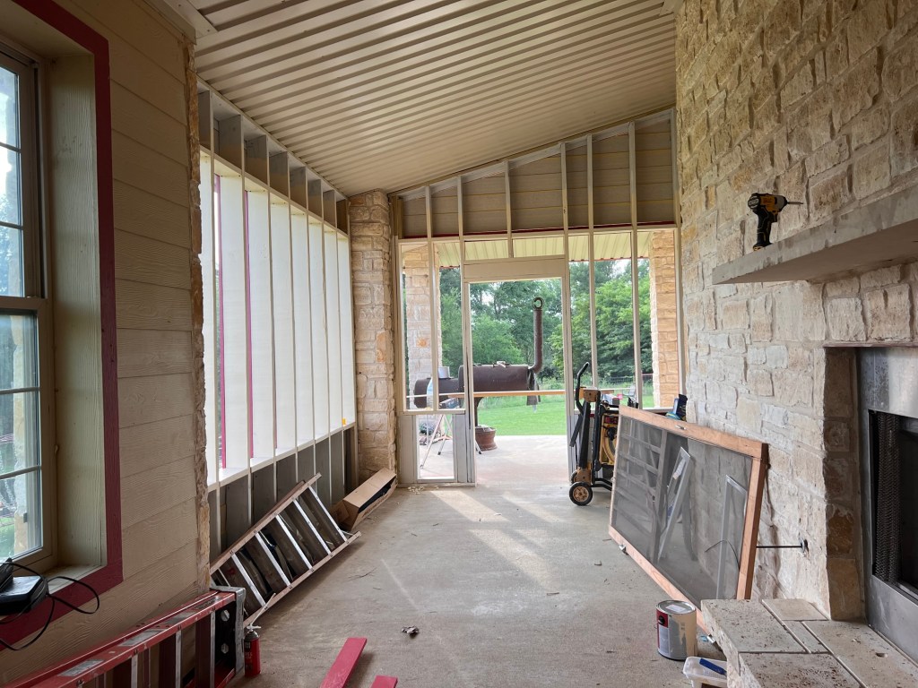 We haven’t been able to do much fixing up around here lately, but the construction team made time for us to start an upgrade. We’re fulfilling Lee’s dream of turning an awkward space in our house into a screened porch.