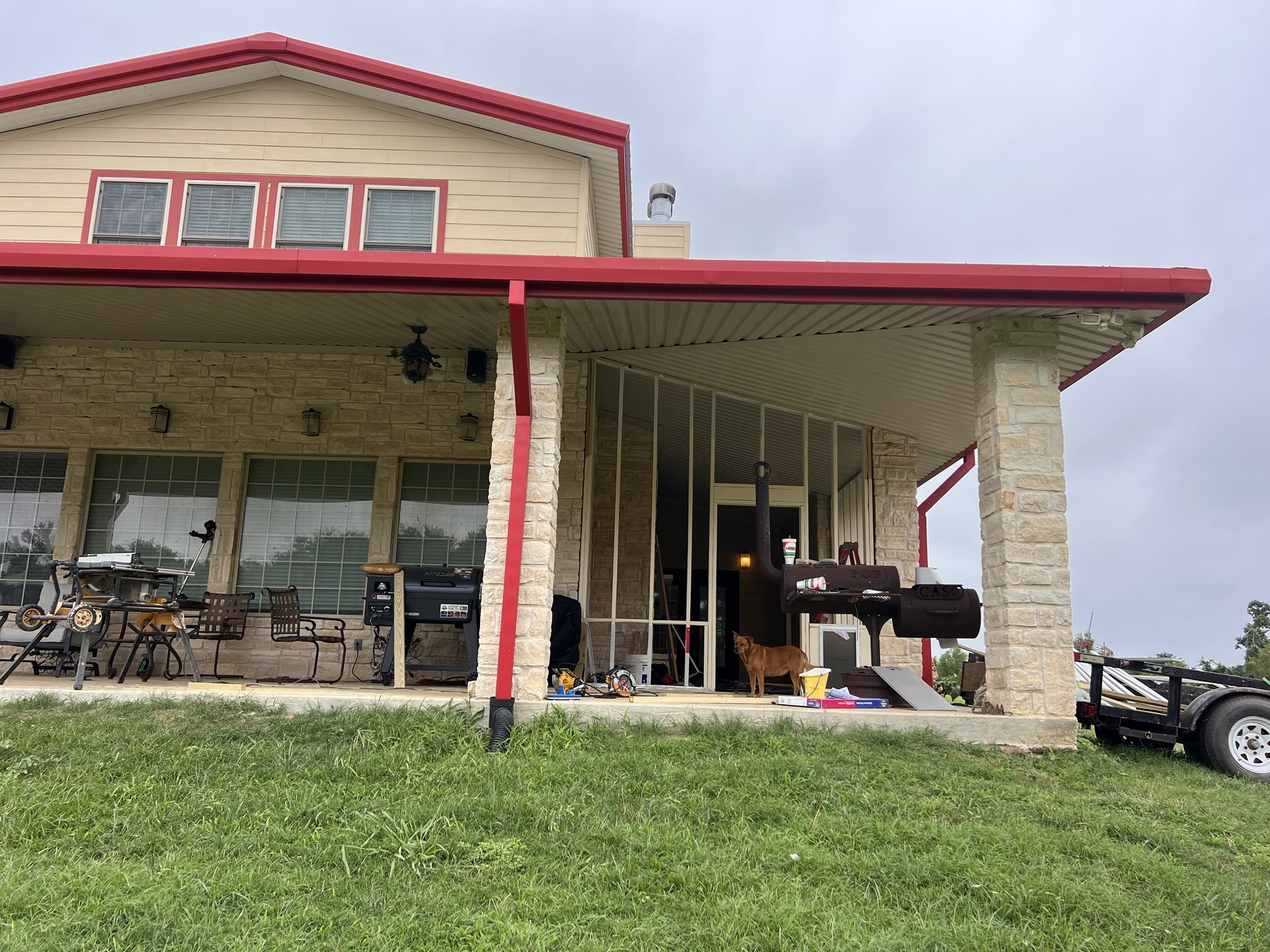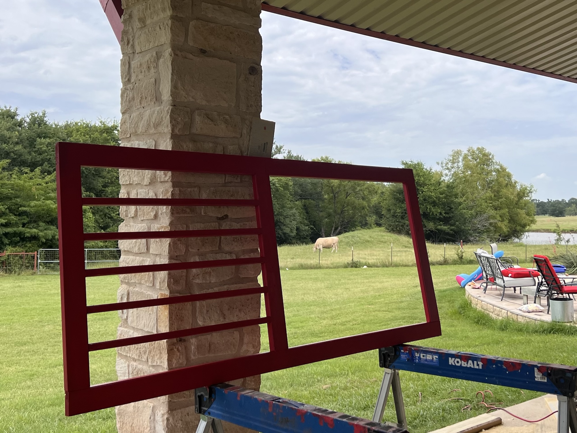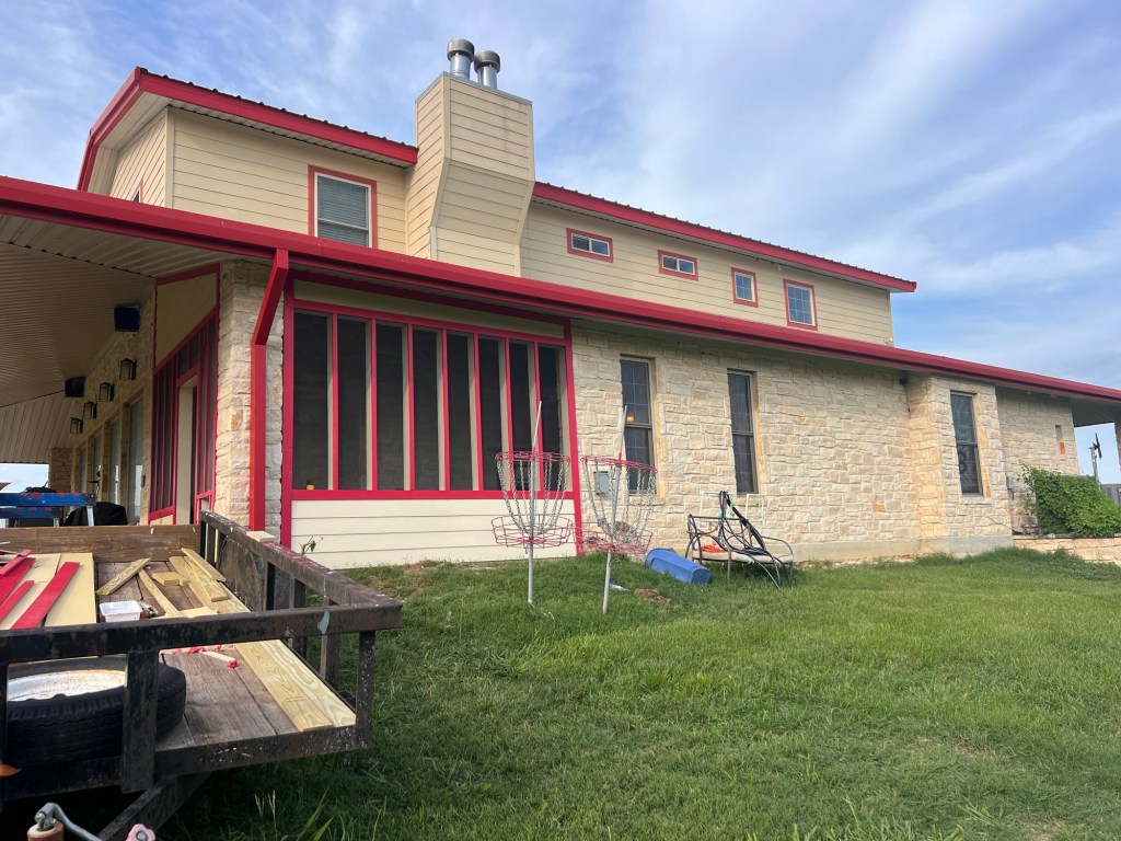 The little “outdoor room” on the other side of the family room has its own fireplace, and seemed like it would be a great place to hang out. Little did we know that the prevailing winds would create a vortex that sent every piece of debris into the narrow space. And when you have an Alfred, that means piles and piles of dog hair. Add in grass clippings, bird poop from the many Barn Swallow nests, and dust…well it was always awful except about a week after its quarterly cleaning.