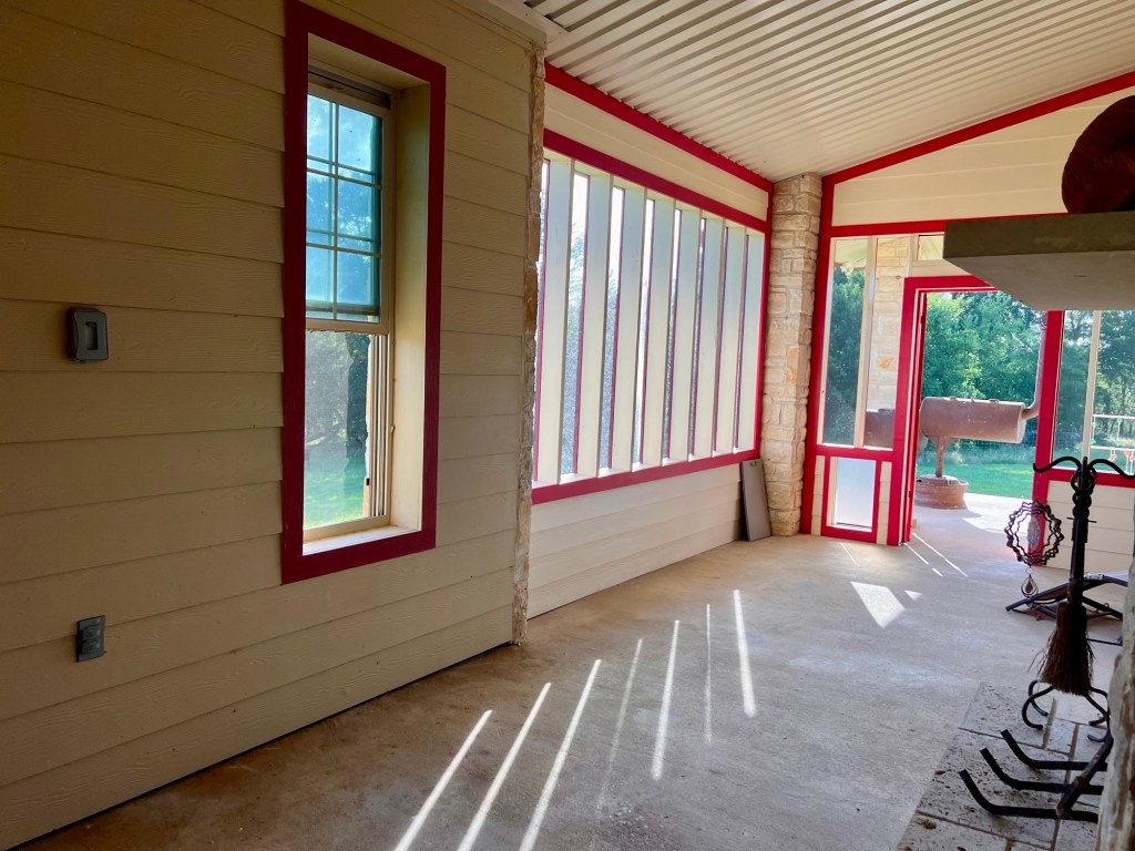 The porch is an extension of the “outdoor room” that was part of the original floor plan of our house. It was open on one side, with doors leading out from the family room and my office and windows on the outside wall. There is even an outdoor fireplace! Sounds great, right?