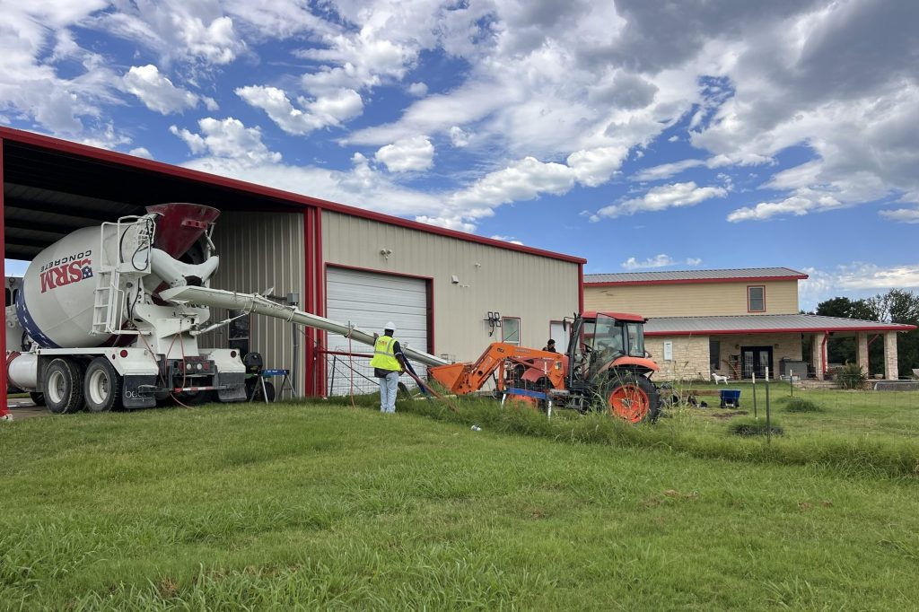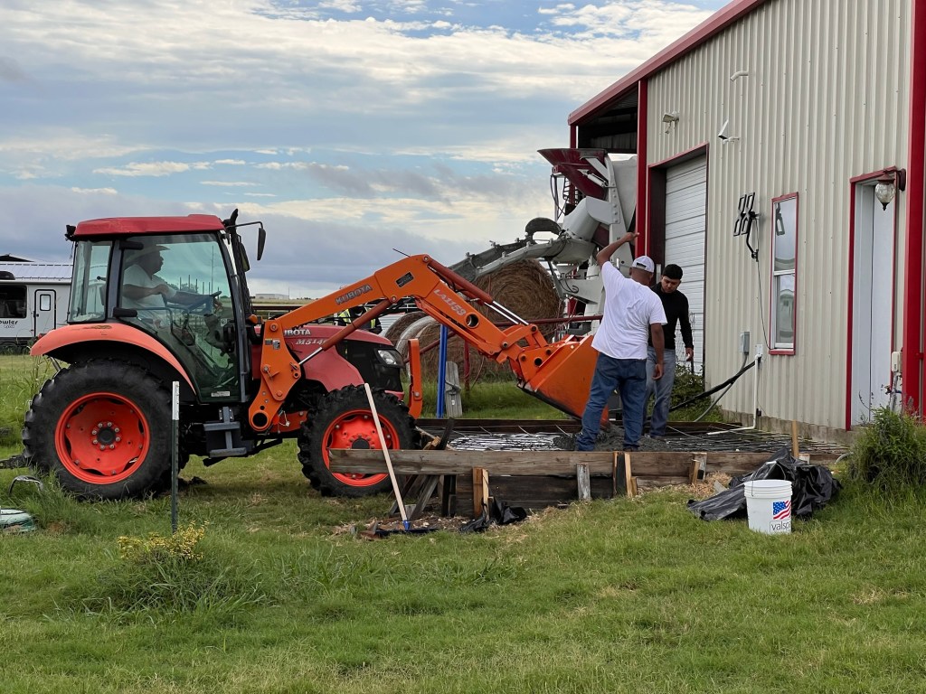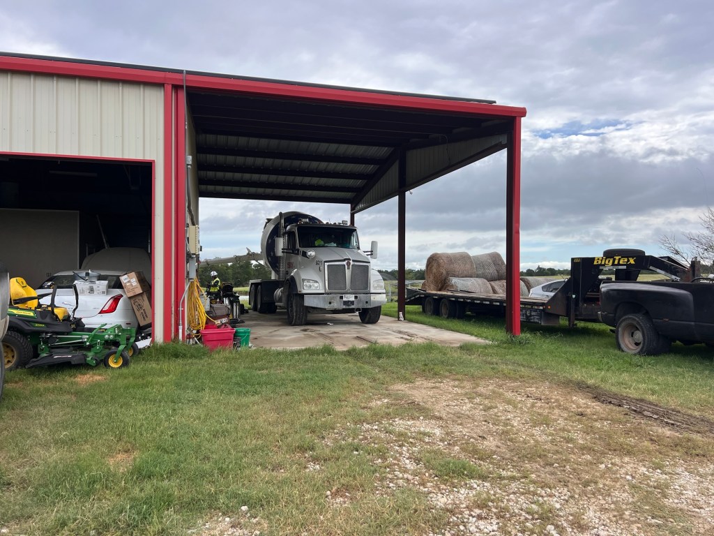 It rained over an inch last night, which made us happy. The front pond/tank is almost back to full capacity, and if we’re lucky, it will rain more this week. Now, the rain put the next “exciting” event in jeopardy, the pouring of the concrete. Nonetheless, it cleared up enough this morning for the big truck to show up and start pouring. Cleverly, it pulled into the RV parking space and could dispense concrete out that way.