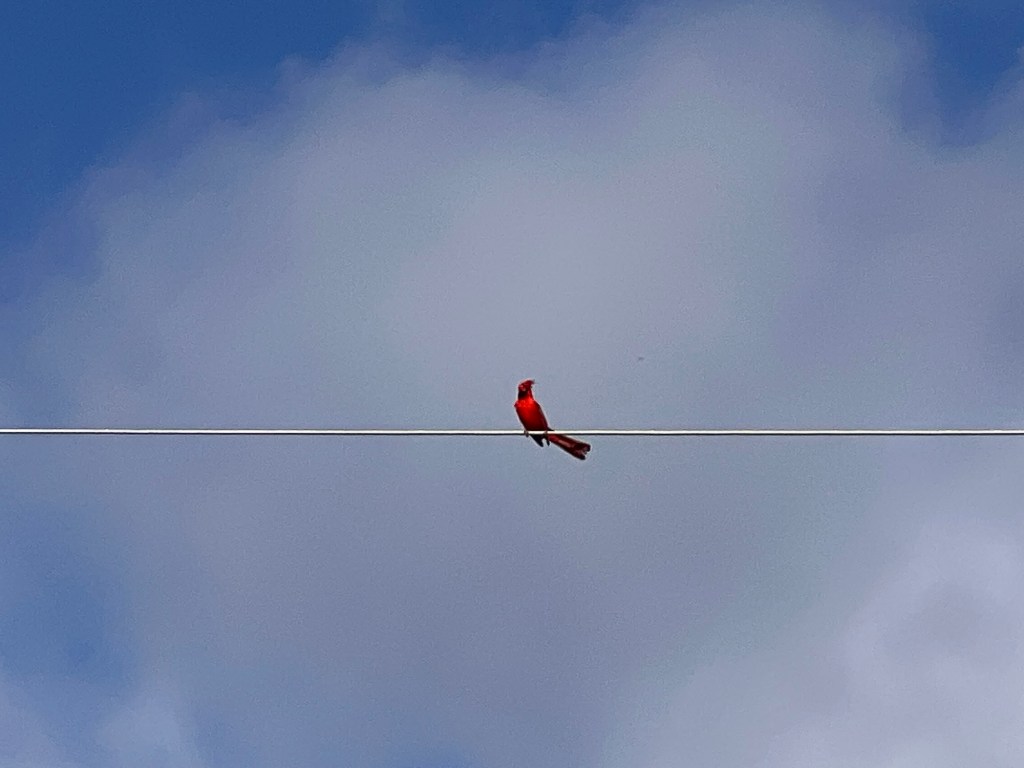 The cat, fleeing when Carlton barked. Kingfisher and friends. Even though it’s blurry, you can ID this guy!Cardinal doesn’t want to be a cat meal. Grr feral cats.