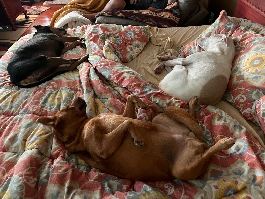 The rest of yesterday was very pleasant. I got some work done on my temperature blanket, which has been delayed due to the package getting lost in the mail. The replacement arrived, and I’m up to the middle of May. Also pleasant was a nice visit from our friends Mike and Martha. We went swimming and then Martha made some spaghetti for dinner. Our weekly dinners have fallen by the wayside, and we need to pick it back up and try to drag Anita over (I haven’t heard from her except on Facebook since April! She’s a hard worker).