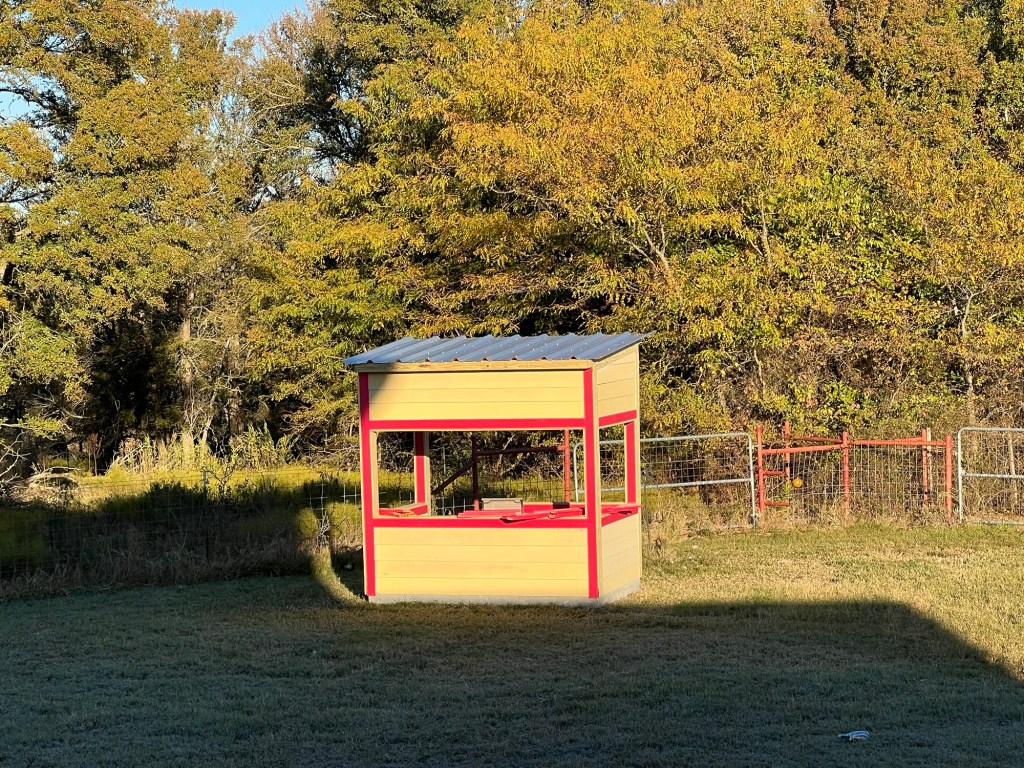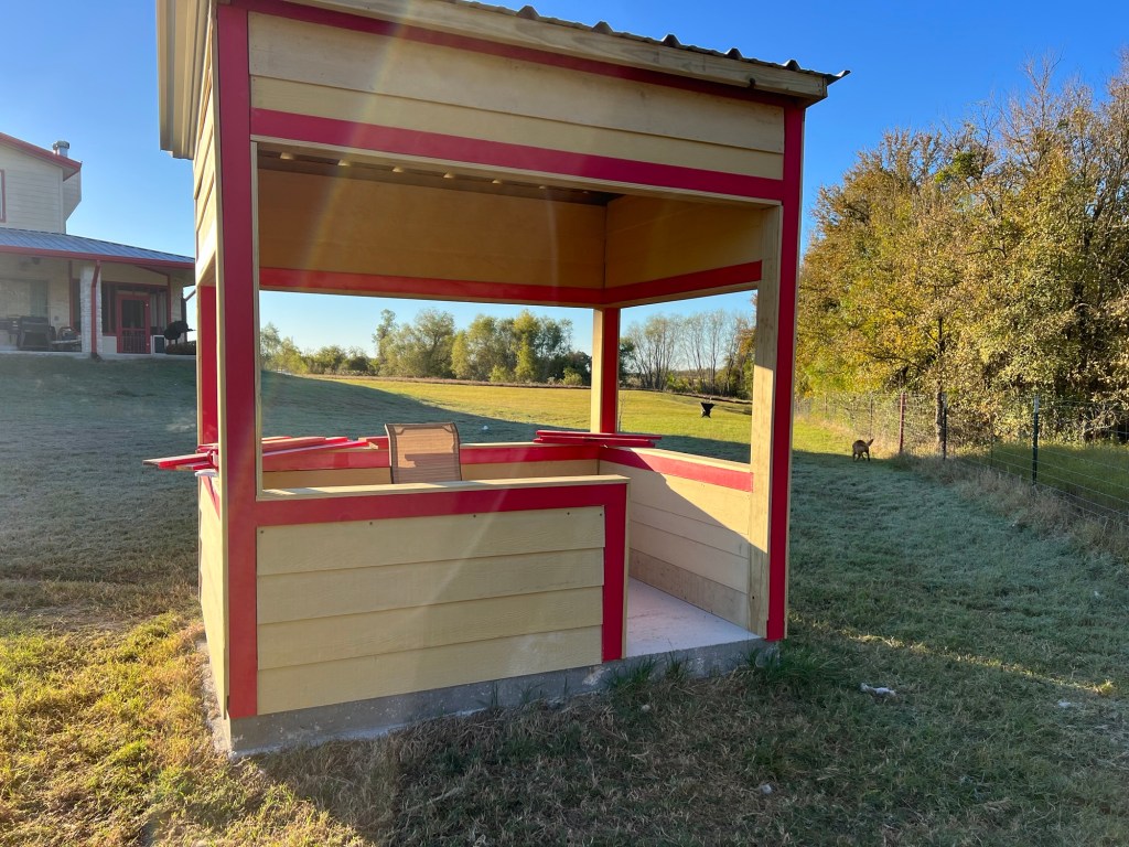 When I got home from my errands, I got to watch more work being done on my birding station. They had to go back for more wood again—I think the design has been refined. I was told the project just eats wood. Anyway, it now has siding along the bottom, so there’s just top and roof left, I think.