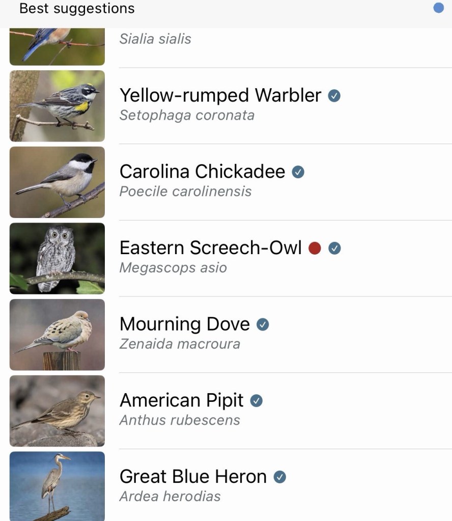 I now feel more confident, since remembered that part of the Merlin app is a feature where it will show you all the birds you’re likely to see on any day. Here are the ones I’m most likely to have seen today in Cameron, Texas. Note the Eastern Phoebe among my good bird buddies.