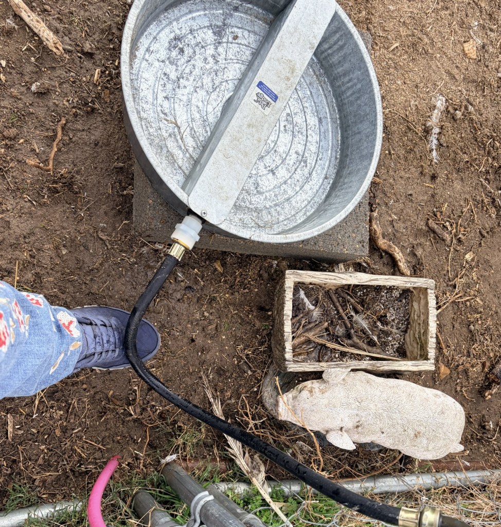 Next I sprayed cold water all over myself trying to fix the automatic waterer without turning off the water. Bright. I did fix it, and my offspring the handyman built a temporary brace to stop big, clumsy Darryl Junior from stomping on the water hose and loosening the connection. Yay.